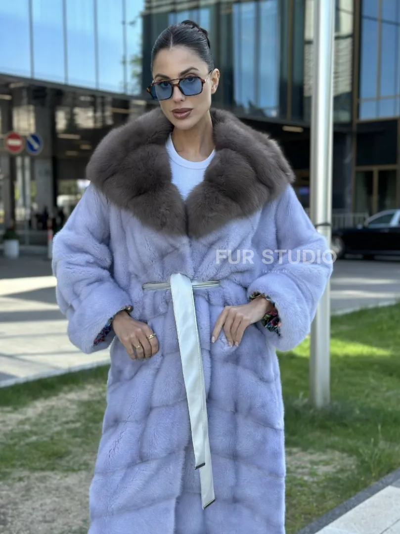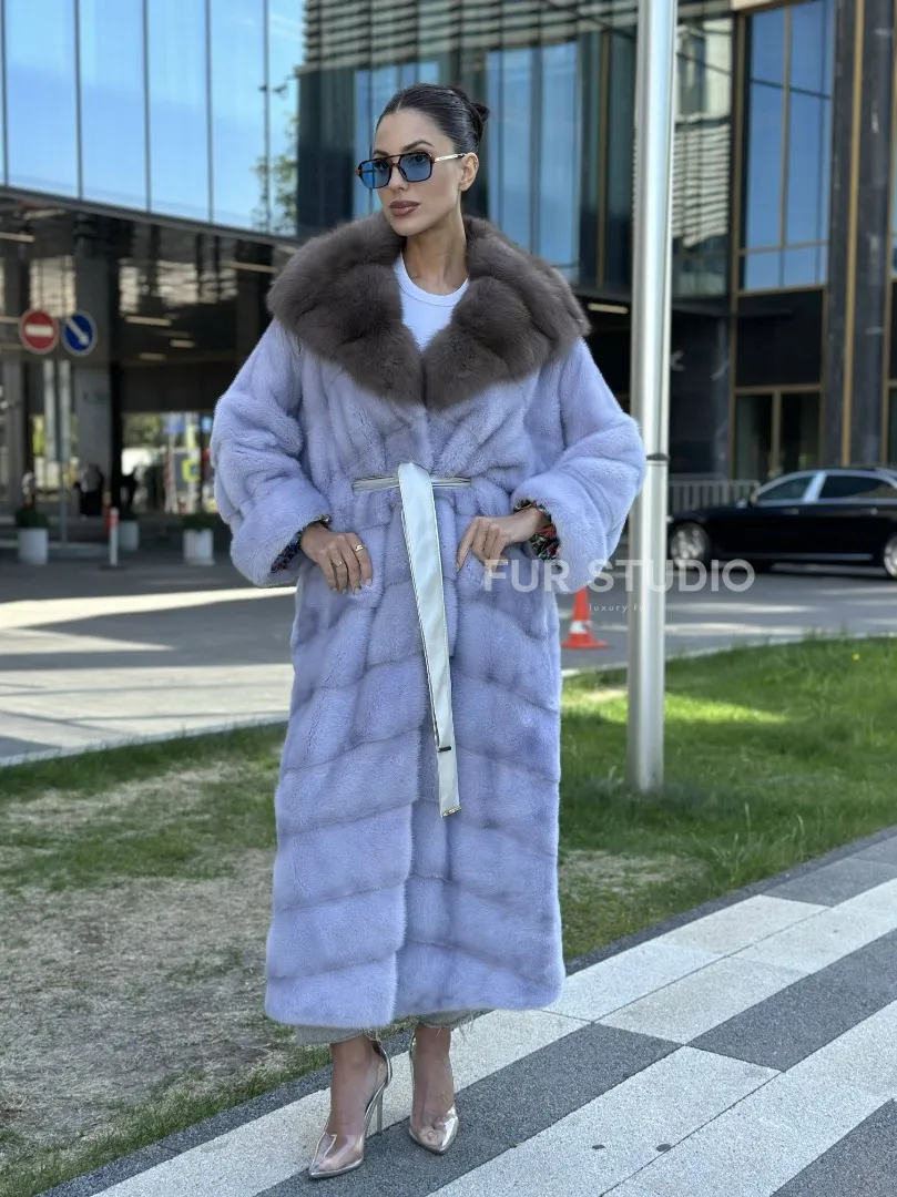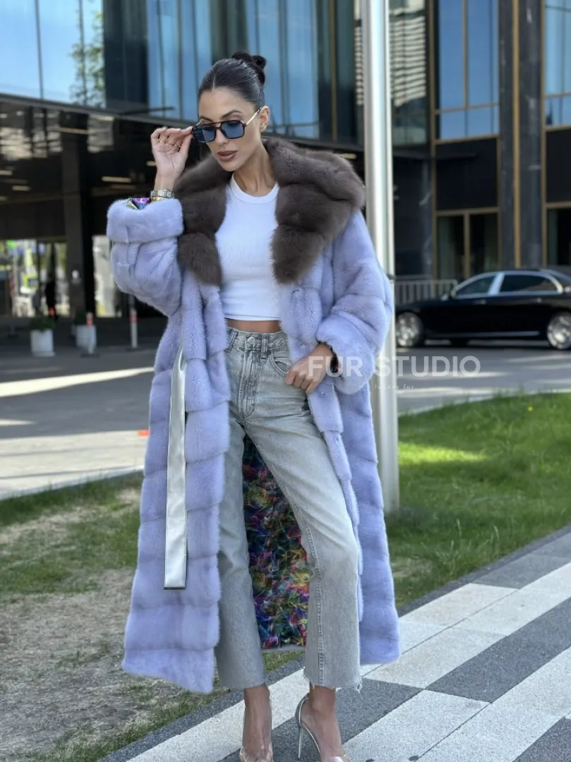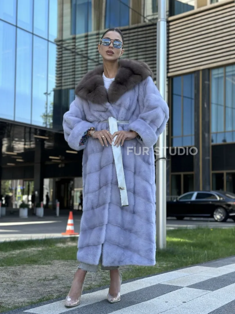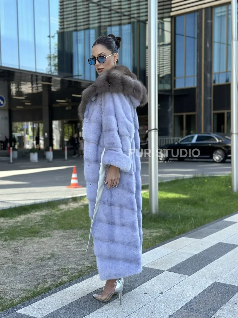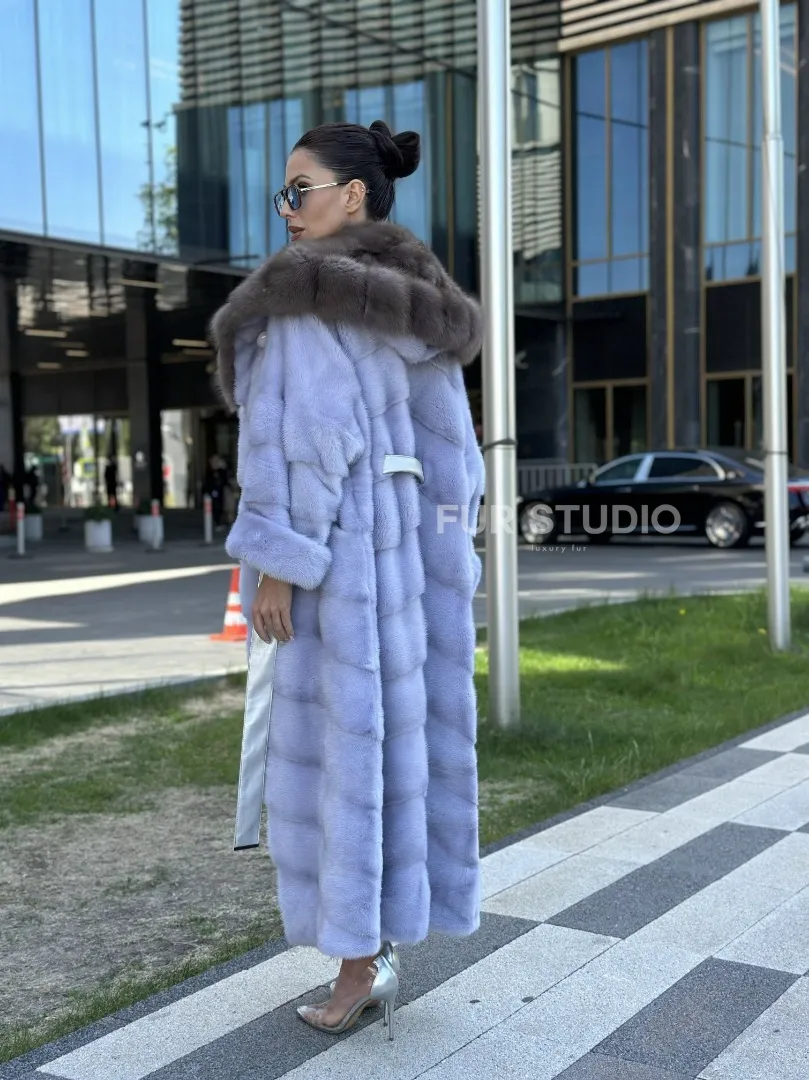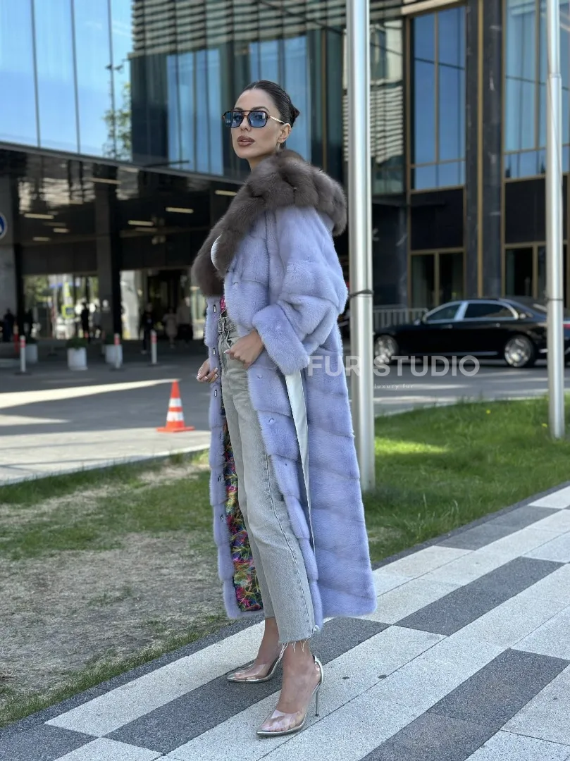 Удлиненная норковая шуба с капюшоном из куницы – выбор экстравагантных дам. Если вы любите быть в центре внимания и приковывать взгляды, то эта модель создана для вас. Яркий цвет выгодно подчеркнет оттенок волос и кожи. Теплый мех позаботится о комфорте в любой холод. Длина бережно прикроет ваши ножки, что позволяет носить даже мини.