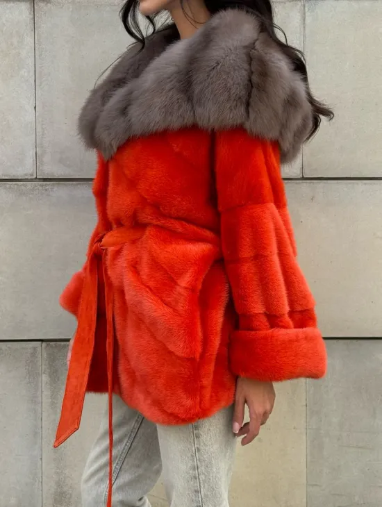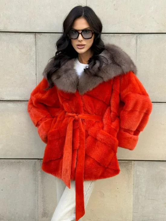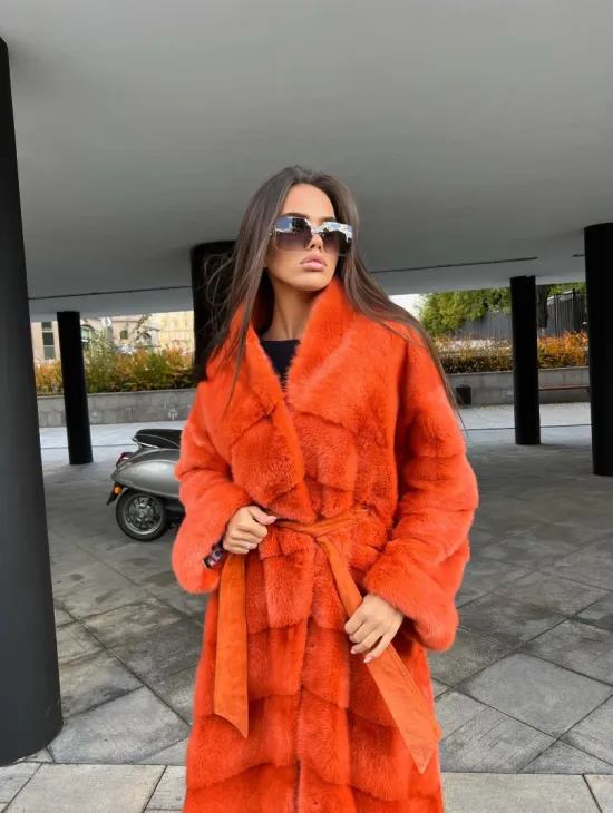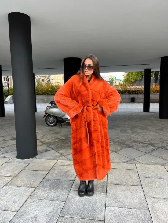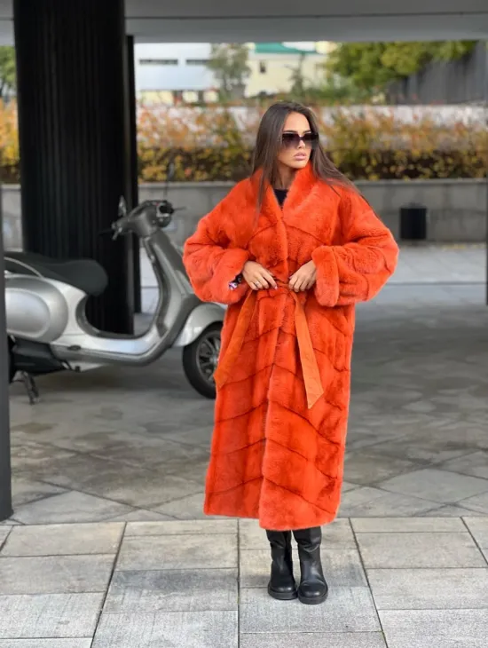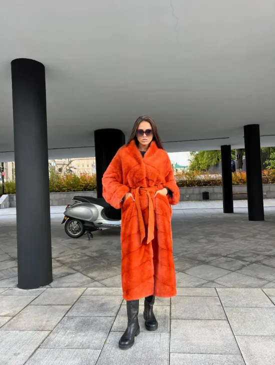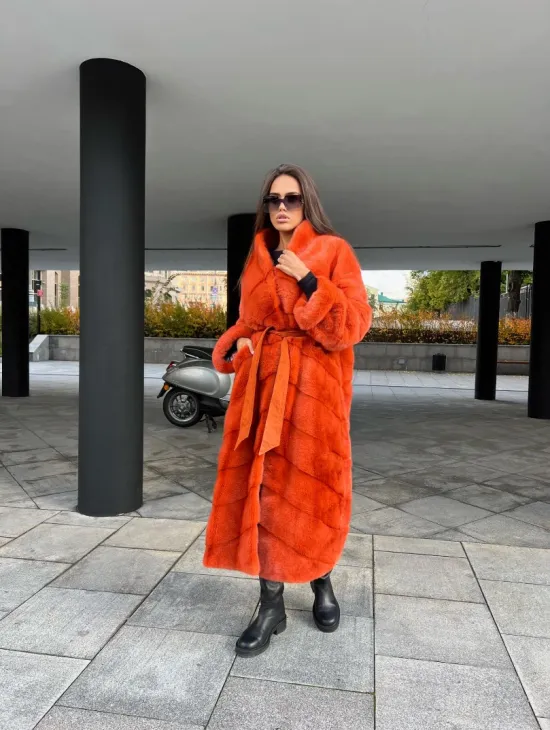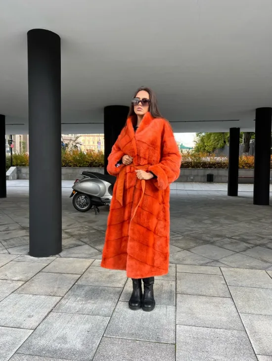 Мех данной шубы аукционная норка, цвет оранжевый. Предлагается в размерах от 40 до 50. Длина модели 115-120 см, что выгодно подчеркивает фигуру девушек. Эта модель идеально подойдет для девушек и женщин, предпочитающих роскошные натуральные меха.