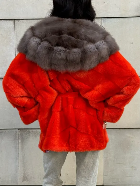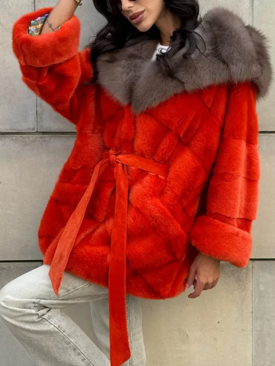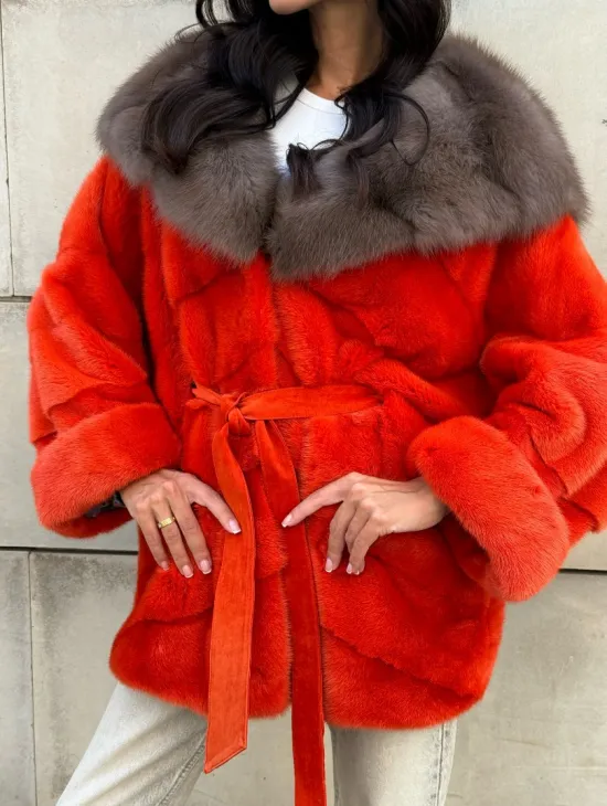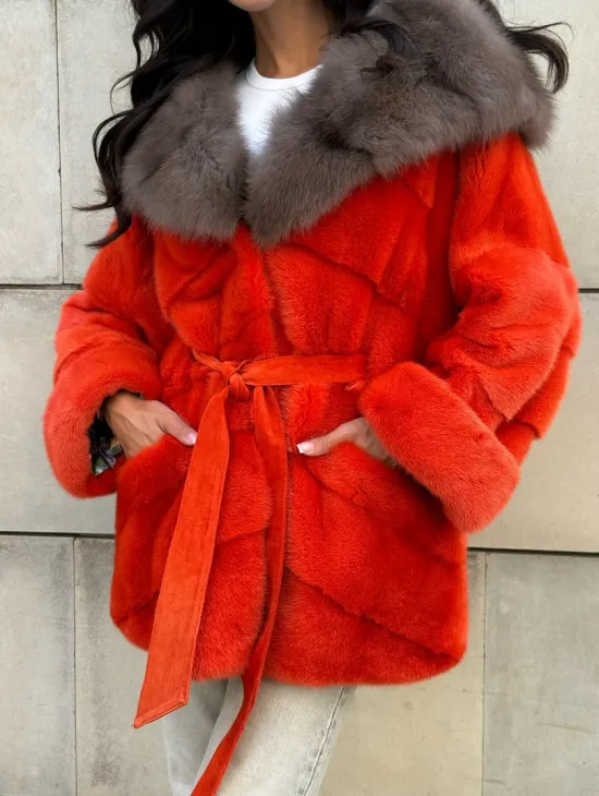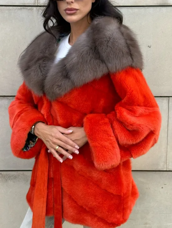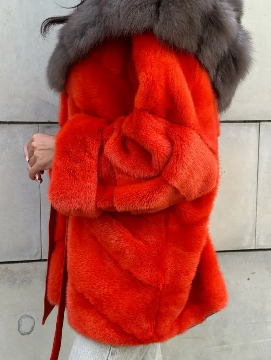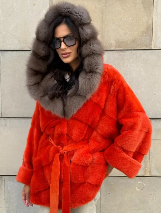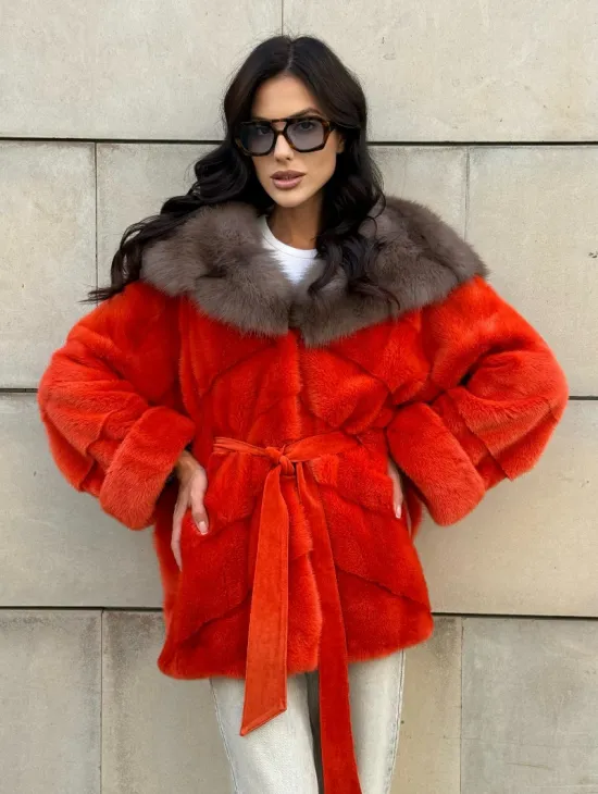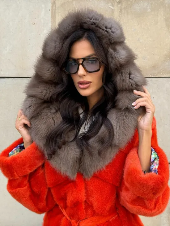 Мех данной шубы аукционная норка, цвет оранжевый. Предлагается в размерах от 40 до 50. Длина модели 115-120 см, что выгодно подчеркивает фигуру девушек. Эта модель идеально подойдет для девушек и женщин, предпочитающих роскошные натуральные меха.