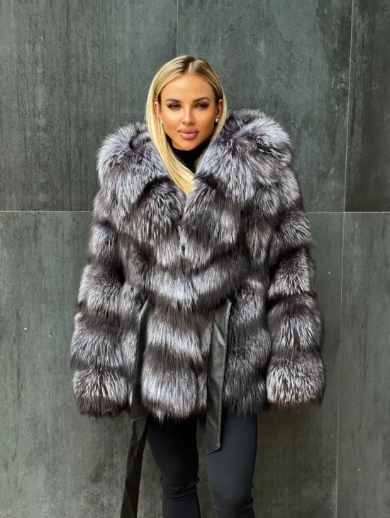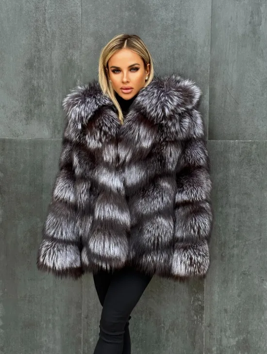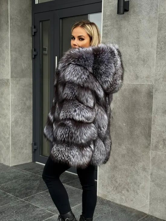 Мех данной шубы лиса, цвет серый. Предлагается в размерах от 42 до 50. Длина модели 90-95 см, что выгодно подчеркивает фигуру девушек. Эта модель идеально подойдет для девушек и женщин, предпочитающих роскошные натуральные меха.