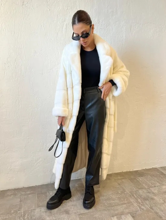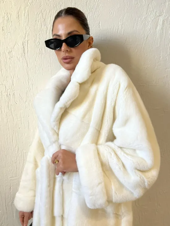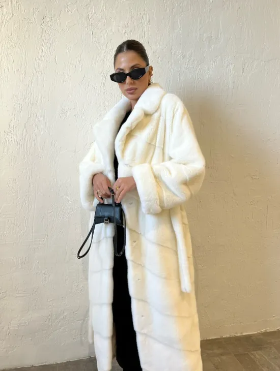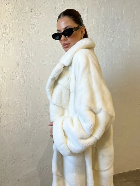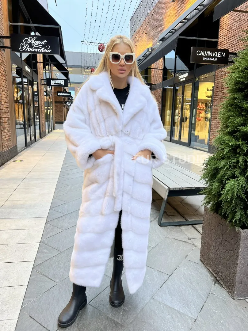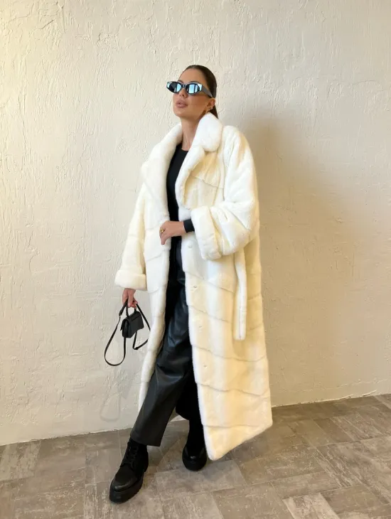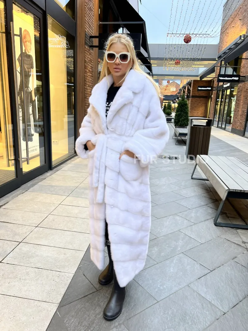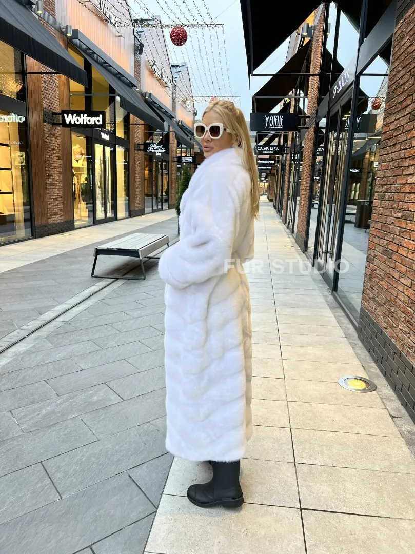 Удлиненная шуба из меха аукционной норки в цвете паломино - идеальный вариант верхней одежды для холодного времени года. Белый цвет делает образ нежным и воздушным. Длина комфортна в носке. Шуба прикрывает все части тела, а это удобно для девушек, которые любят ходить в коротких юбках зимой. Шикарный капюшон позаботится о прическе в ветреную погоду.