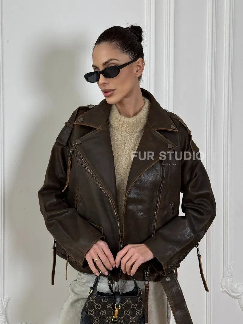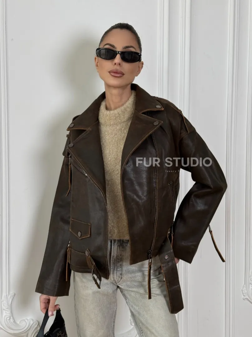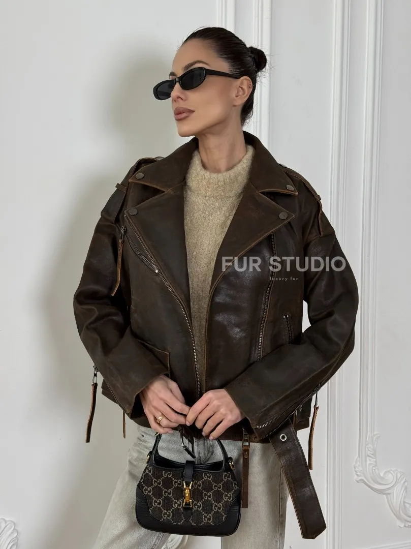 Vintage Brown кожаная куртка - косуха оверсайз с затертыми швами доступна для покупки в нашем шоуруме Furs Studio в Москве, где также предоставляется удобная доставка во все города России.