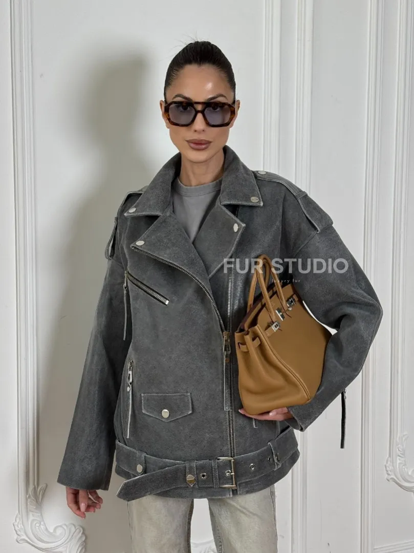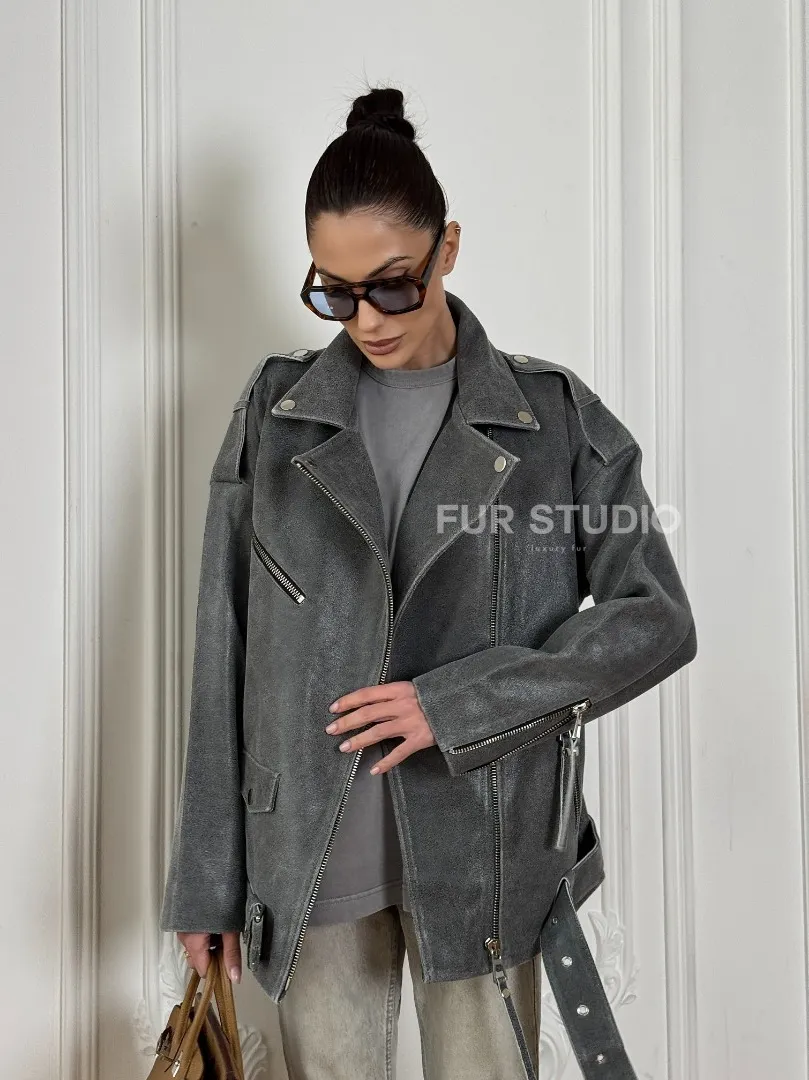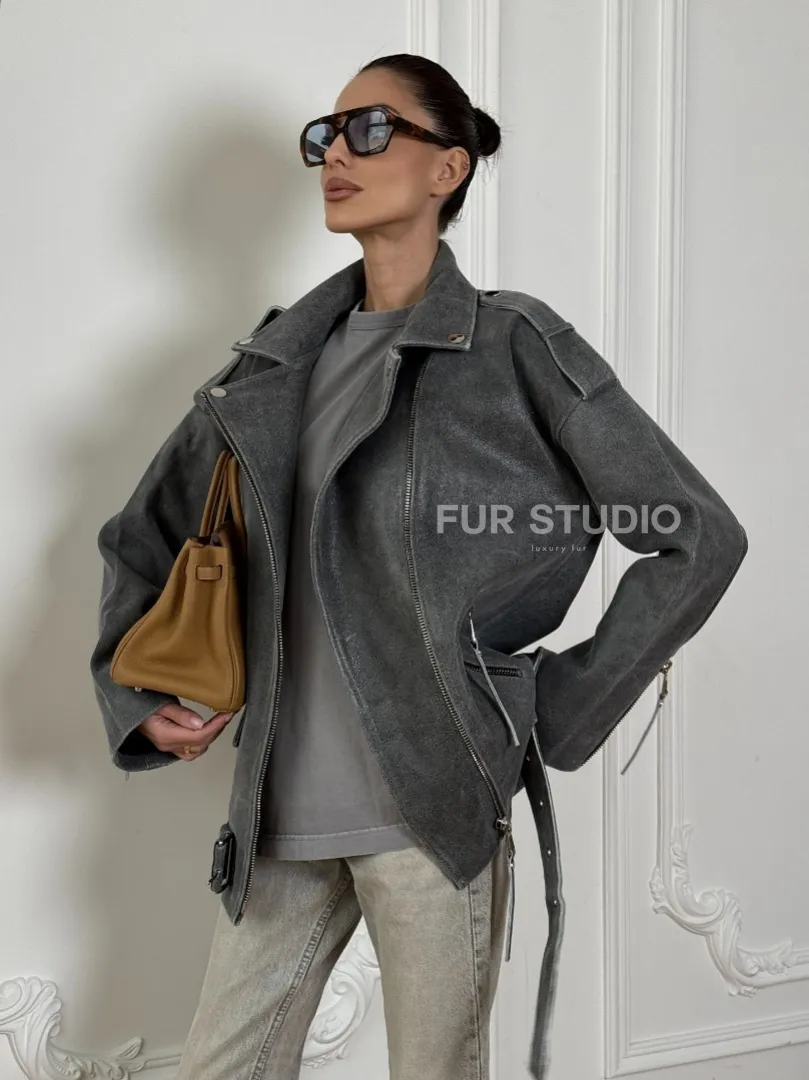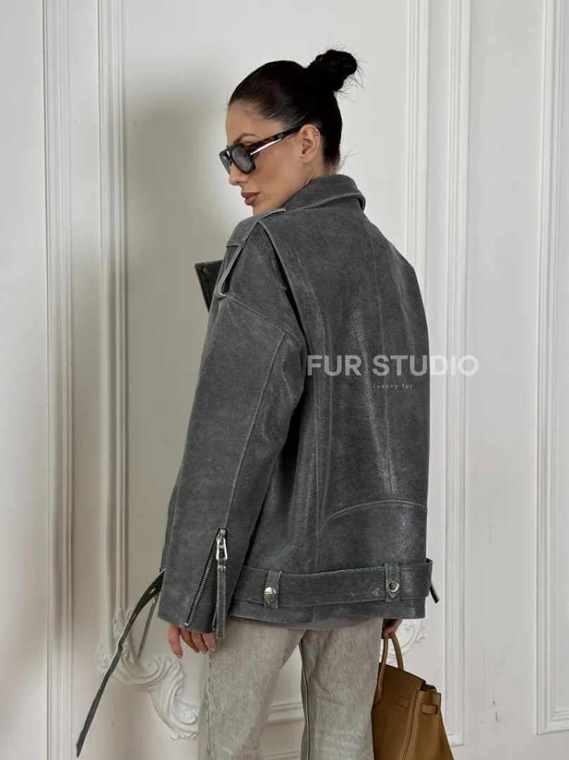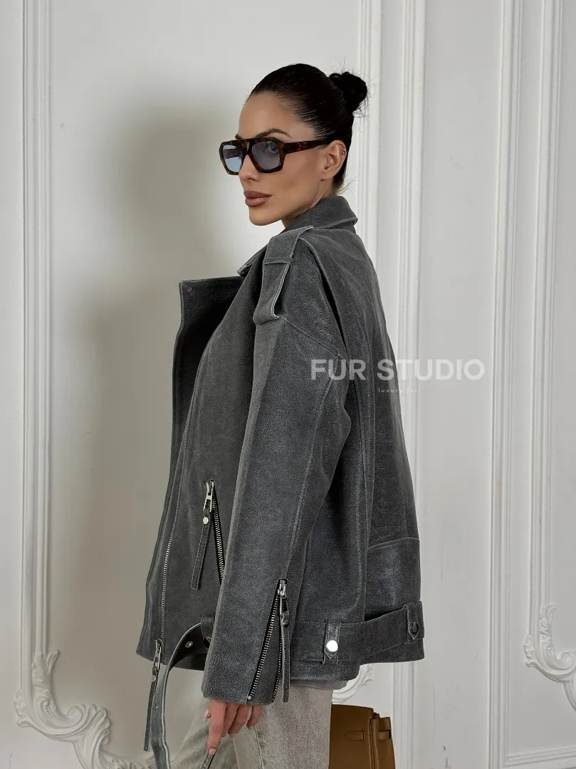 Винтажная кожаная косуха оверсайз - серый графит доступна для покупки в нашем шоуруме Furs Studio в Москве, где также предоставляется удобная доставка во все города России.