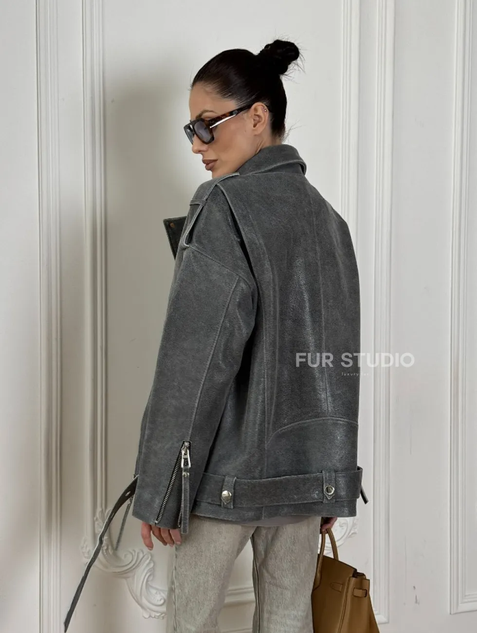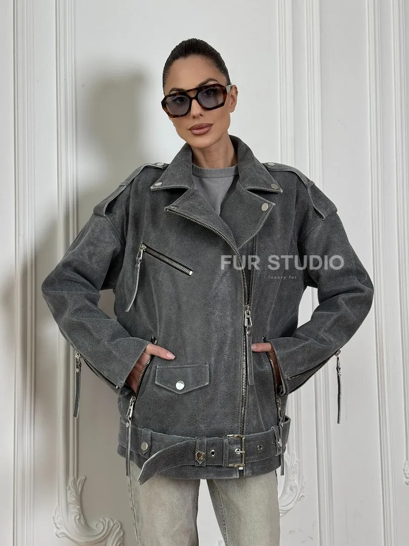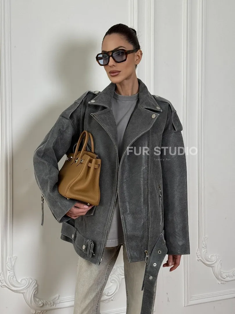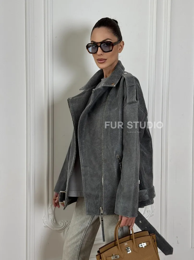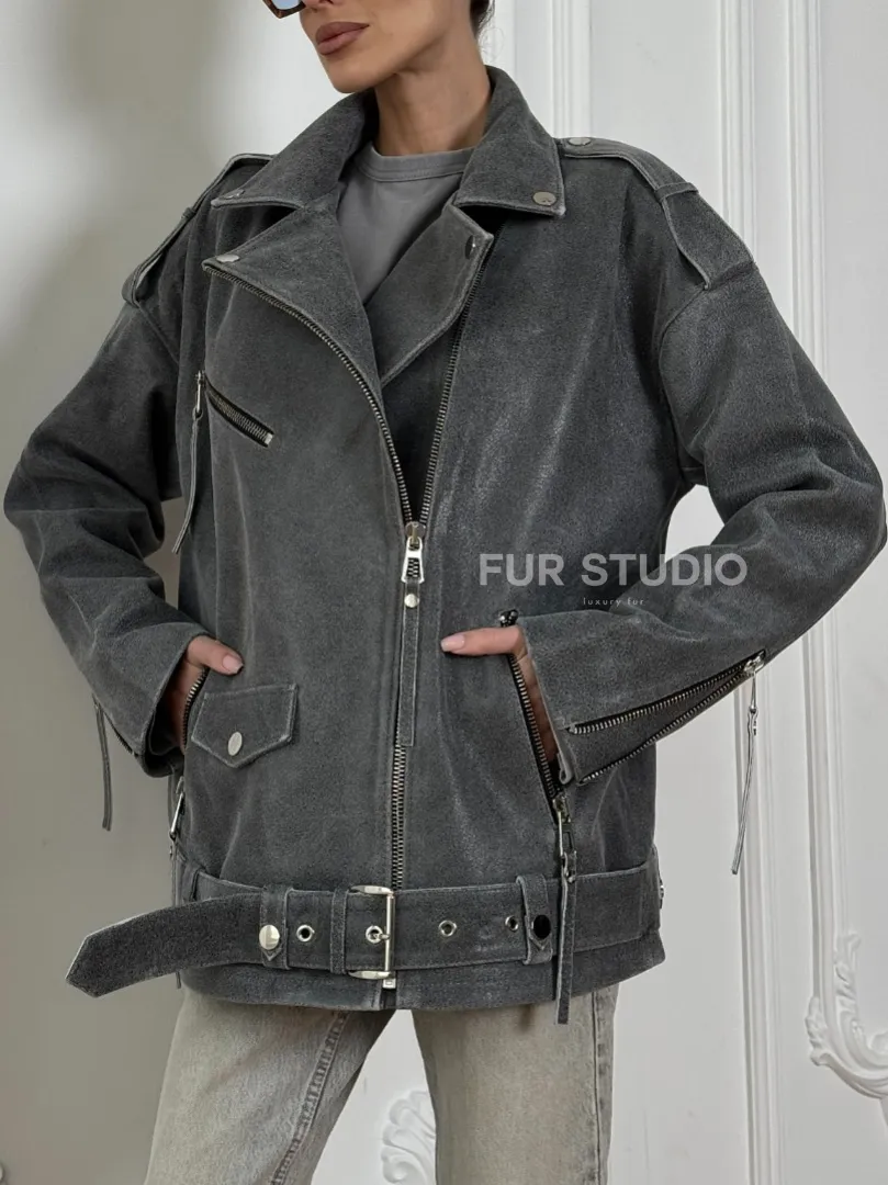 Винтажная кожаная косуха оверсайз - серый графит доступна для покупки в нашем шоуруме Furs Studio в Москве, где также предоставляется удобная доставка во все города России.