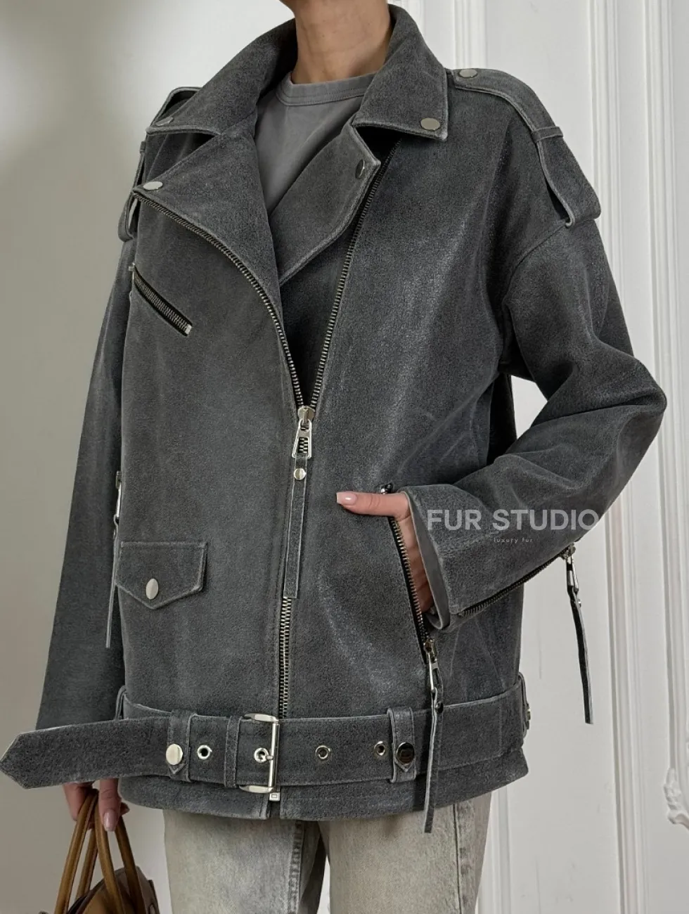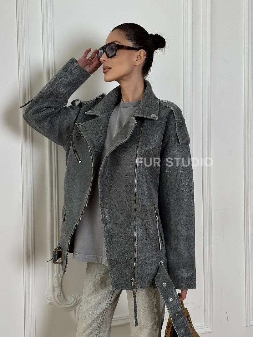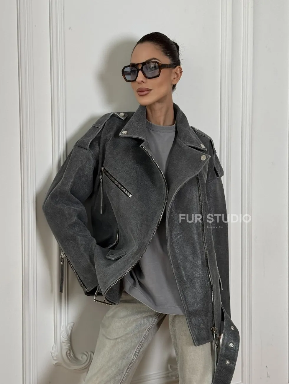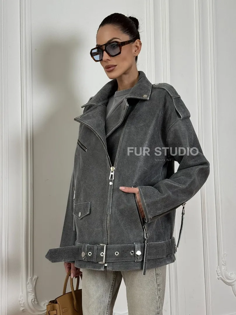 Винтажная кожаная косуха оверсайз - серый графит доступна для покупки в нашем шоуруме Furs Studio в Москве, где также предоставляется удобная доставка во все города России.
