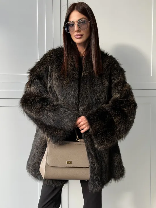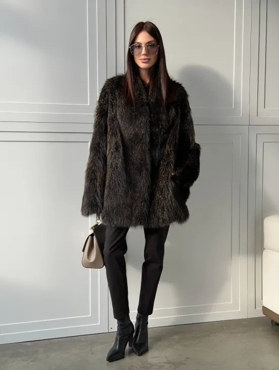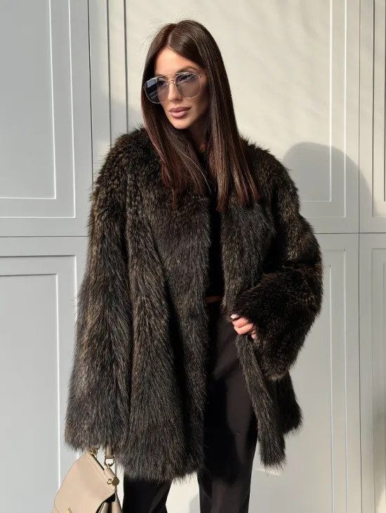 Мех данной шубы енот, цвет коричневый. Предлагается в размерах от 42 до 50. Длина модели 70-75 см, что выгодно подчеркивает фигуру девушек. Эта модель идеально подойдет для девушек и женщин, предпочитающих роскошные натуральные меха.
