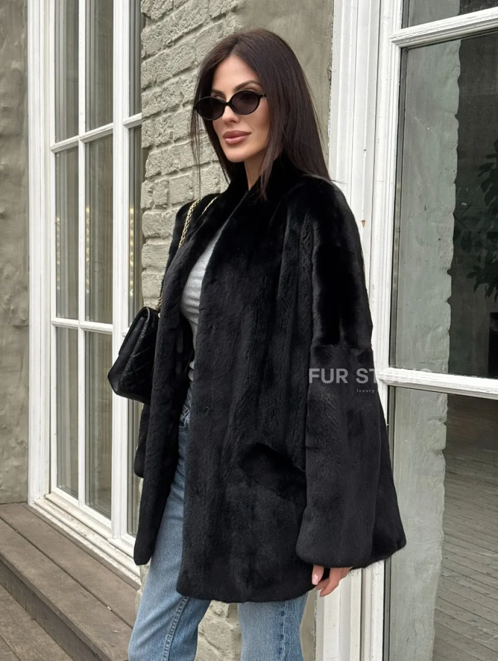 Мех данной шубы норка Blackglama, цвет черный. Предлагается в размерах от 40 до 48. Длина модели 70-75 см, что выгодно подчеркивает фигуру девушек. Эта модель идеально подойдет для девушек и женщин, предпочитающих роскошные натуральные меха.