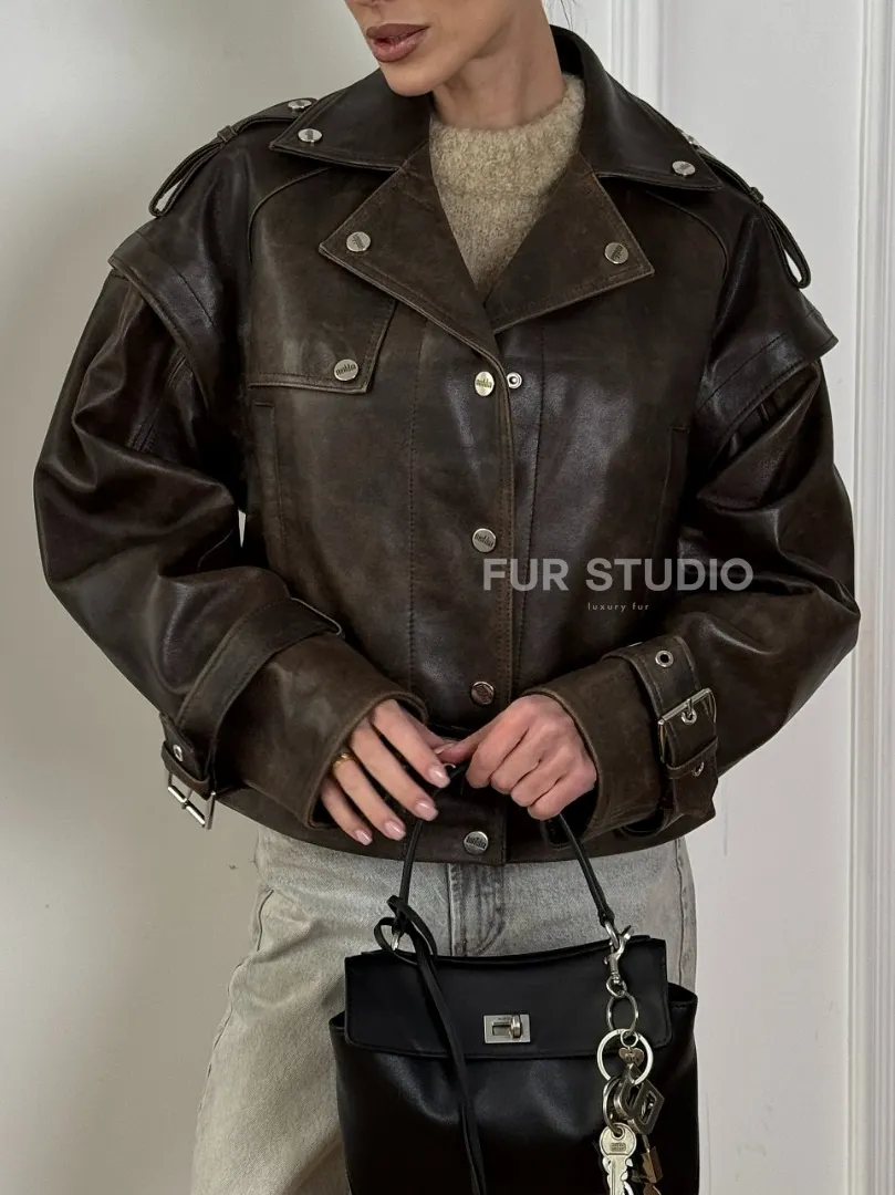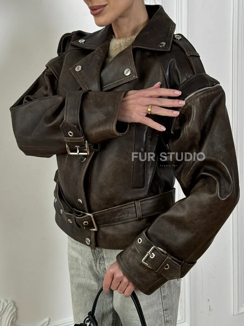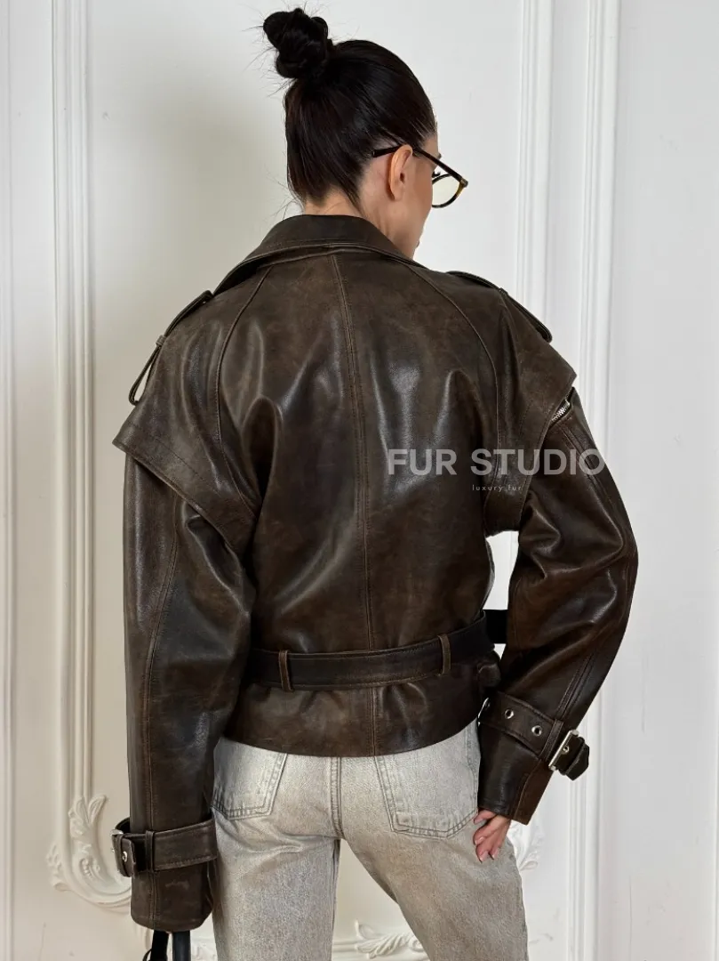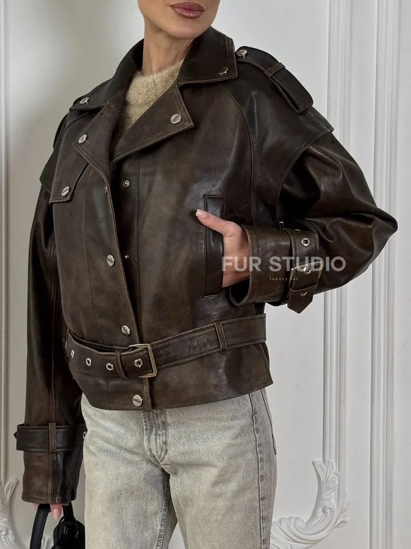 Женская косуха - жилет 2в1 трансформер из натуральной винтажной кожи доступна для покупки в нашем шоуруме Furs Studio в Москве, где также предоставляется удобная доставка во все города России.