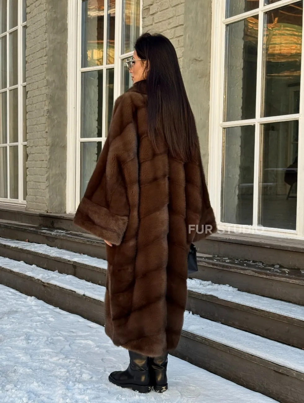 Мех данной шубы аукционная норка, цвет коричневый. Предлагается в размерах от 42 до 66. Длина модели 115-120 см, что выгодно подчеркивает фигуру девушек. Эта модель идеально подойдет для девушек и женщин, предпочитающих роскошные натуральные меха.