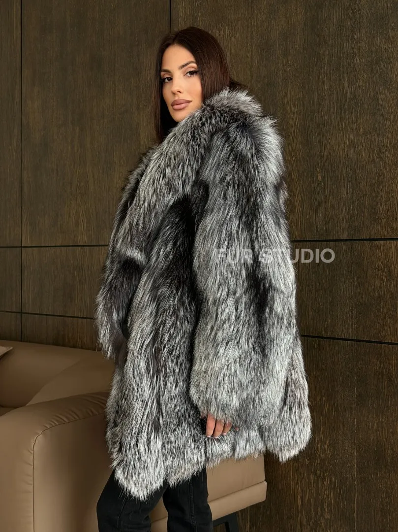 Мех данной шубы лиса, цвет серый. Предлагается в размерах от 42 до 50. Длина модели 80-85 см, что выгодно подчеркивает фигуру девушек. Эта модель идеально подойдет для девушек и женщин, предпочитающих роскошные натуральные меха.