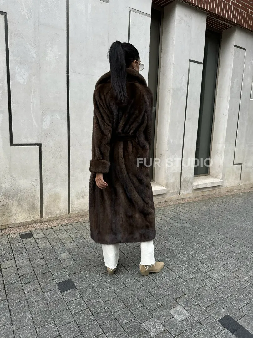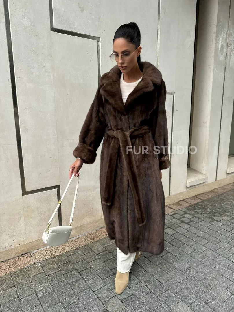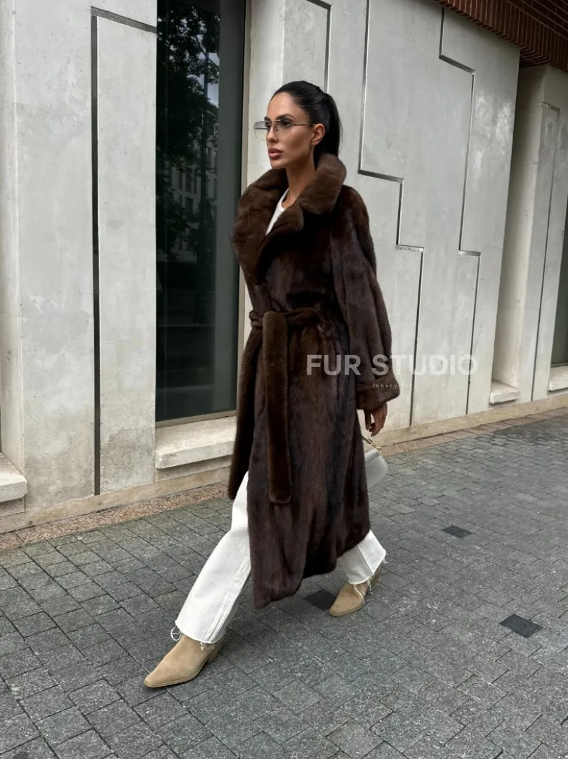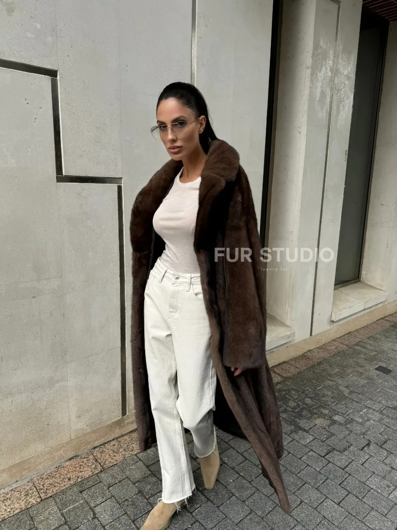 Мех данной шубы аукционная норка , цвет коричневый. Предлагается в размерах от 42 до 50 с 52. Длина модели 115-120 см, что выгодно подчеркивает фигуру девушек. Эта модель идеально подойдет для девушек и женщин, предпочитающих роскошные натуральные меха.