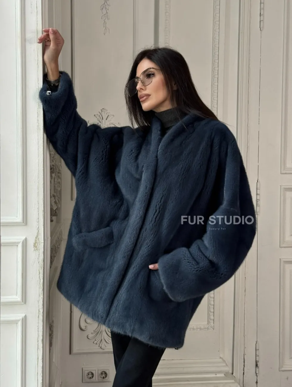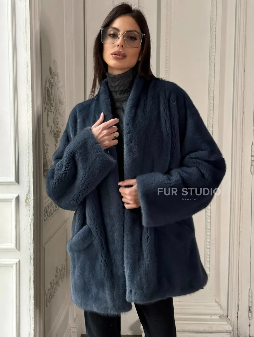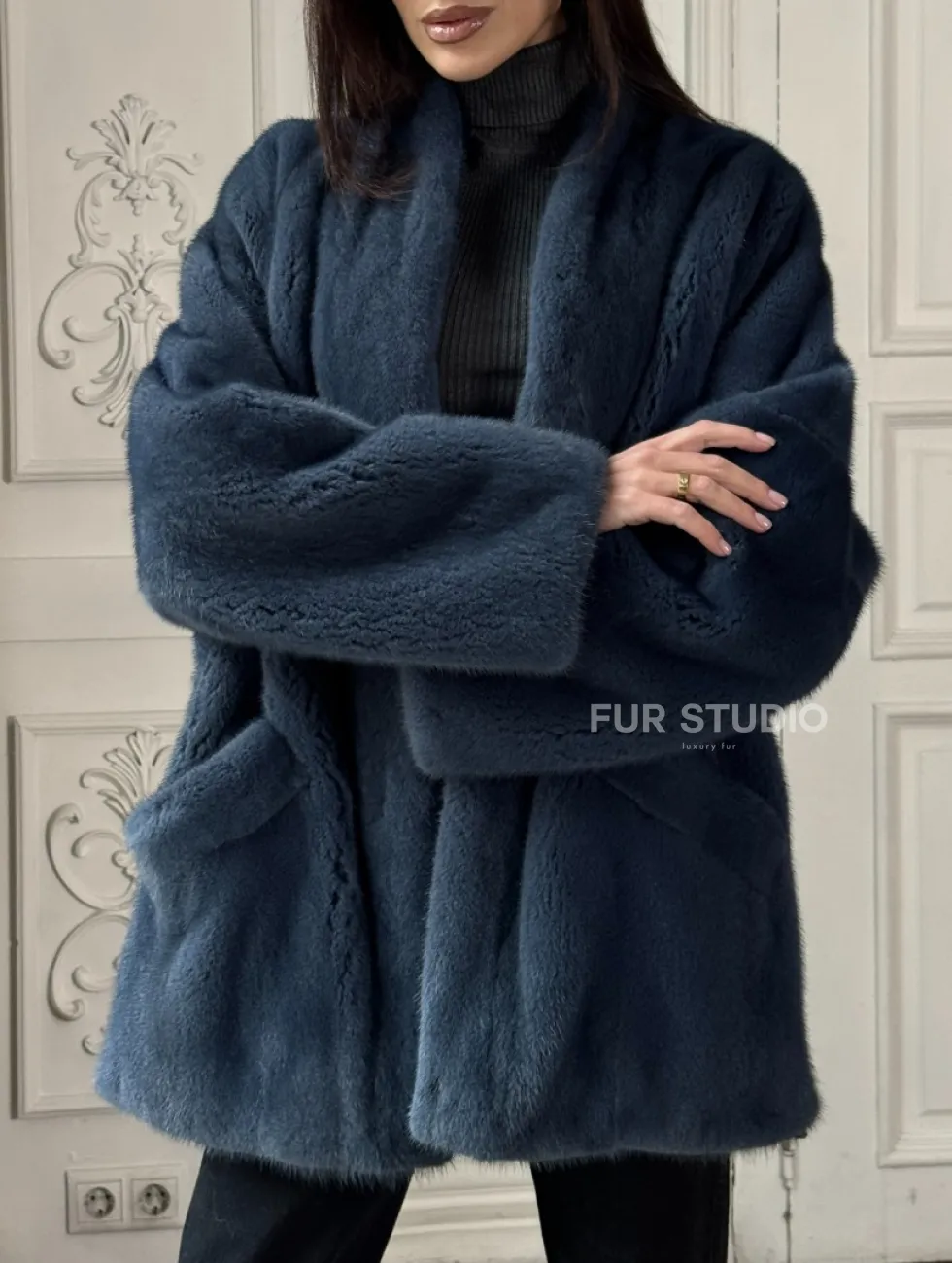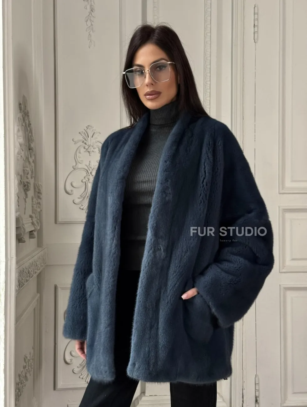 Мех данной шубы скандинавская норка, цвет синий. Предлагается в размерах от 42 до 52. Длина модели 70-75 см, что выгодно подчеркивает фигуру девушек. Эта модель идеально подойдет для девушек и женщин, предпочитающих роскошные натуральные меха.