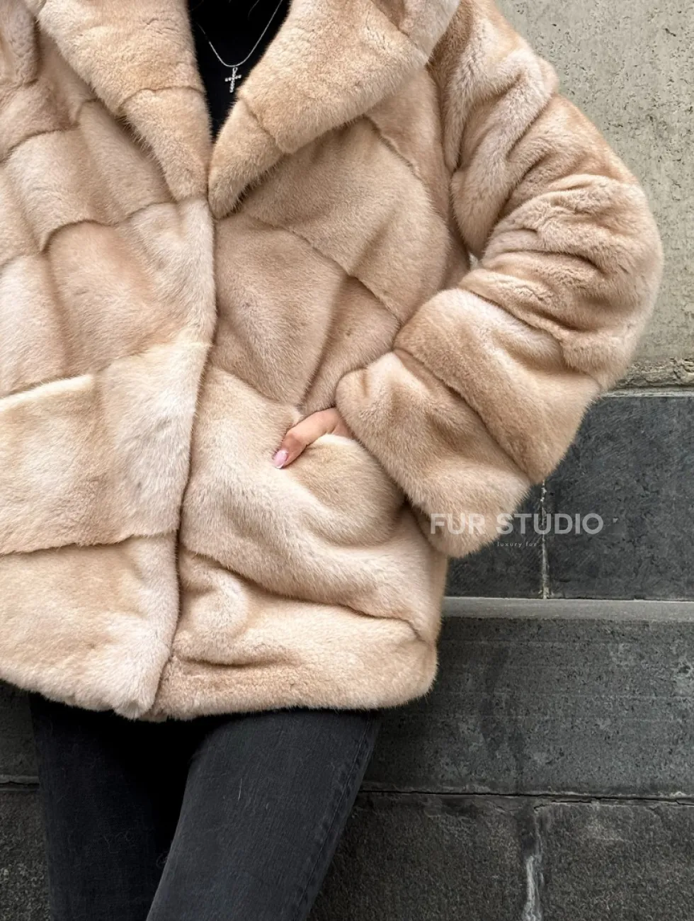 Мех данной шубы скандинавская норка, цвет бежевый. Предлагается в размерах от 42 до 48. Длина модели 65-70 см, что выгодно подчеркивает фигуру девушек. Эта модель идеально подойдет для девушек и женщин, предпочитающих роскошные натуральные меха.