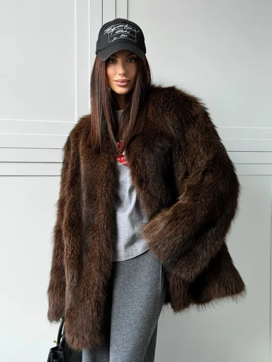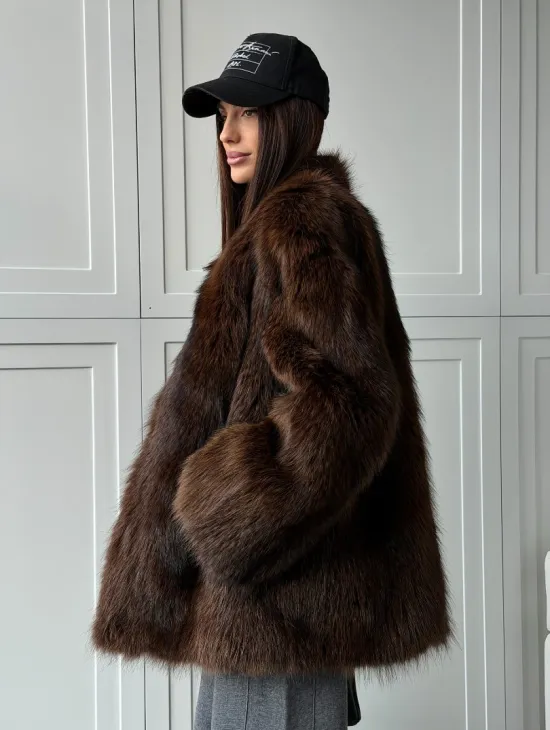 Мех данной шубы енот, цвет коричневый. Предлагается в размерах от 42 до 50. Длина модели 70-75 см, что выгодно подчеркивает фигуру девушек. Эта модель идеально подойдет для девушек и женщин, предпочитающих роскошные натуральные меха.