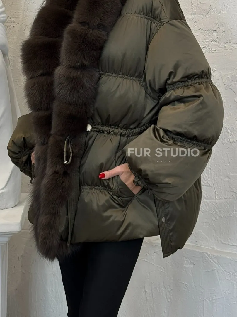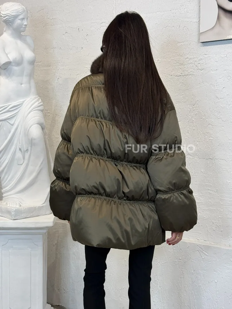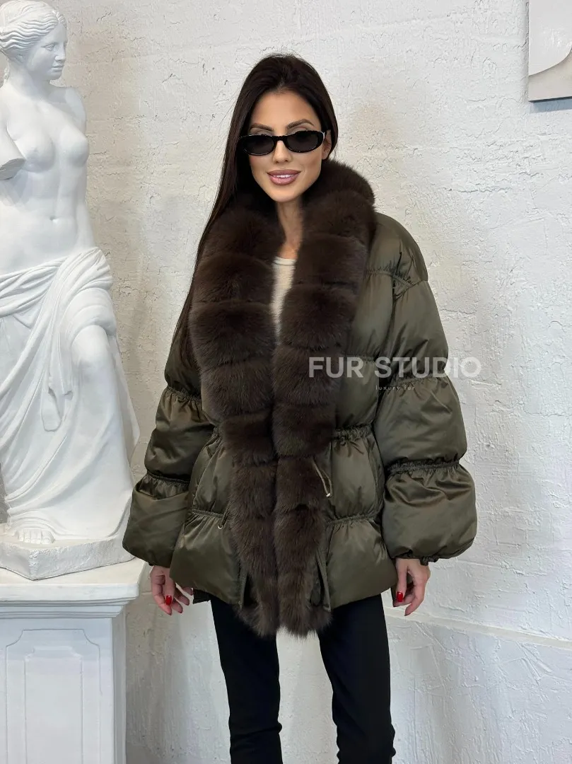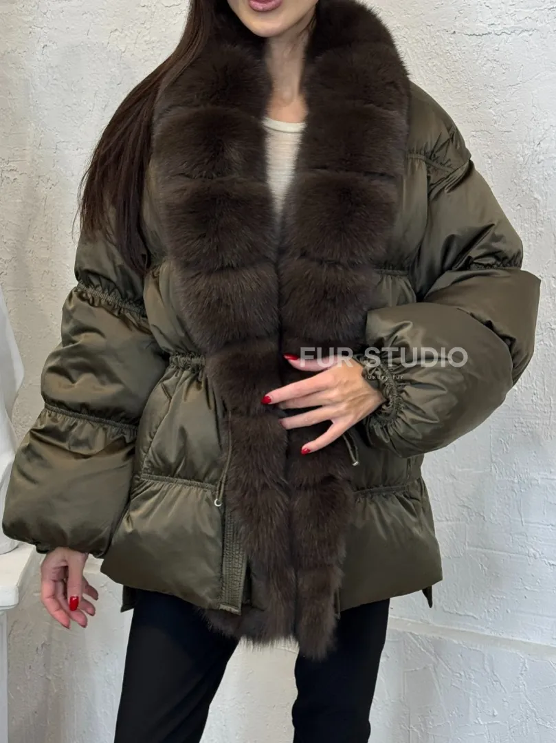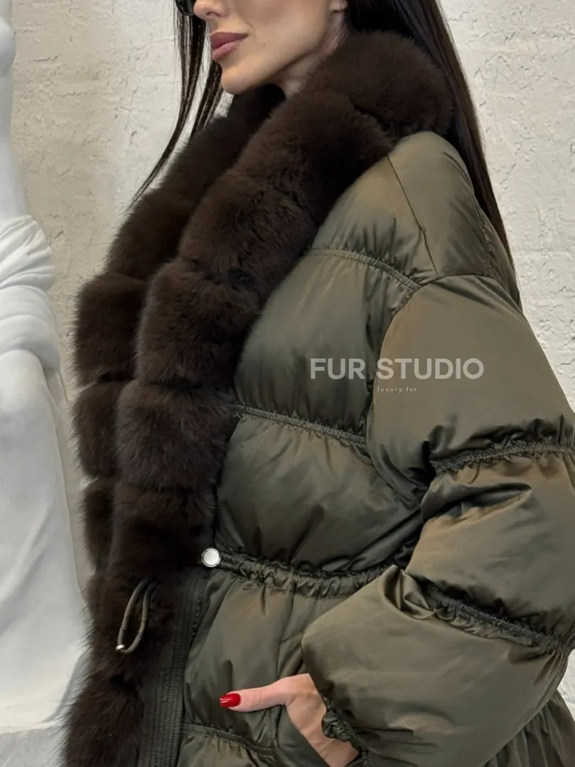 Женский стеганный пуховик на гусином пуху с отделкой из меха песца 101275