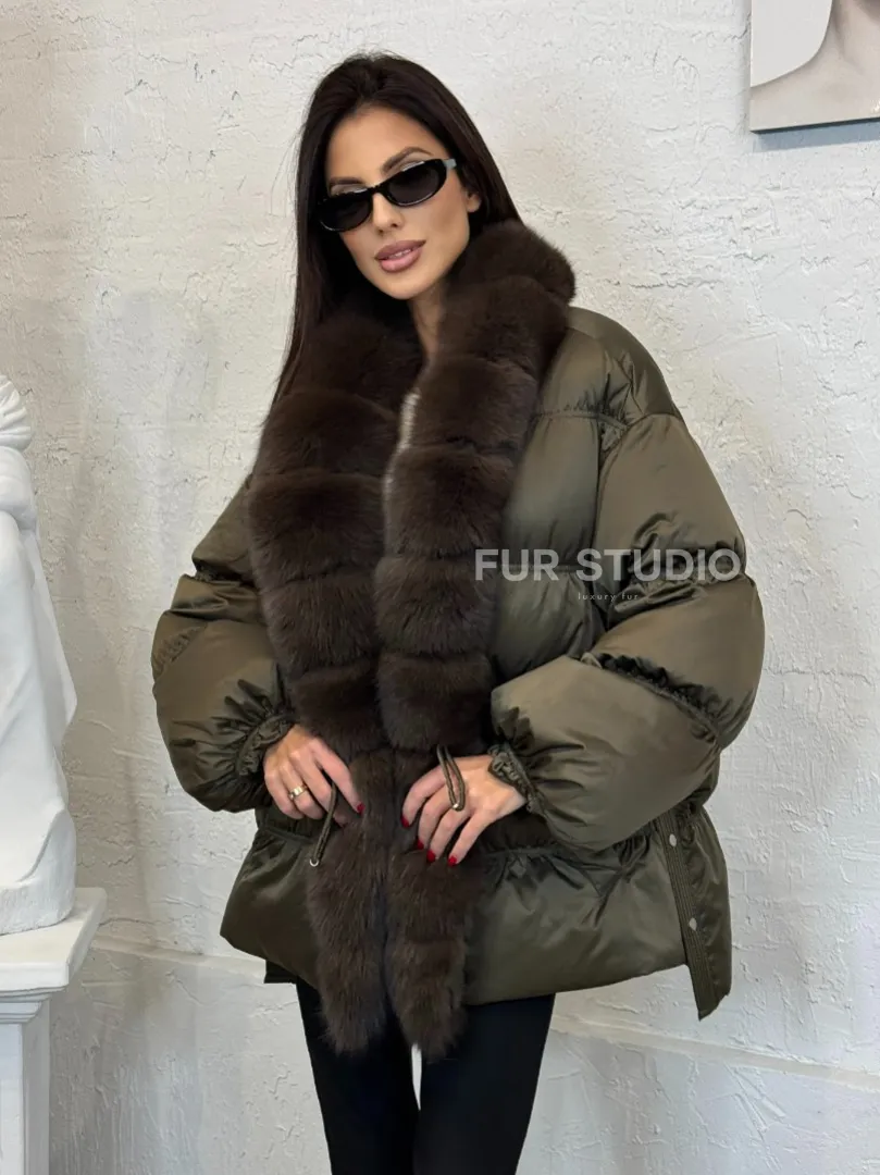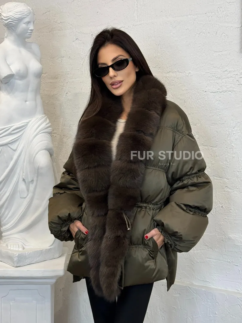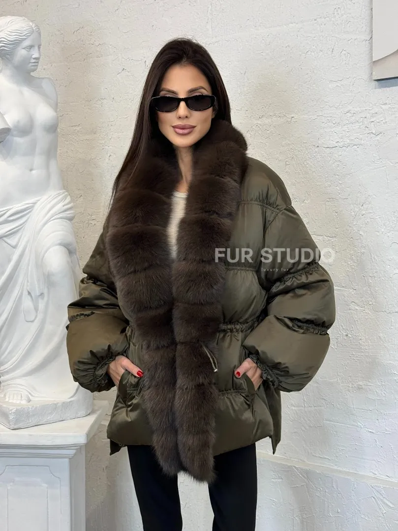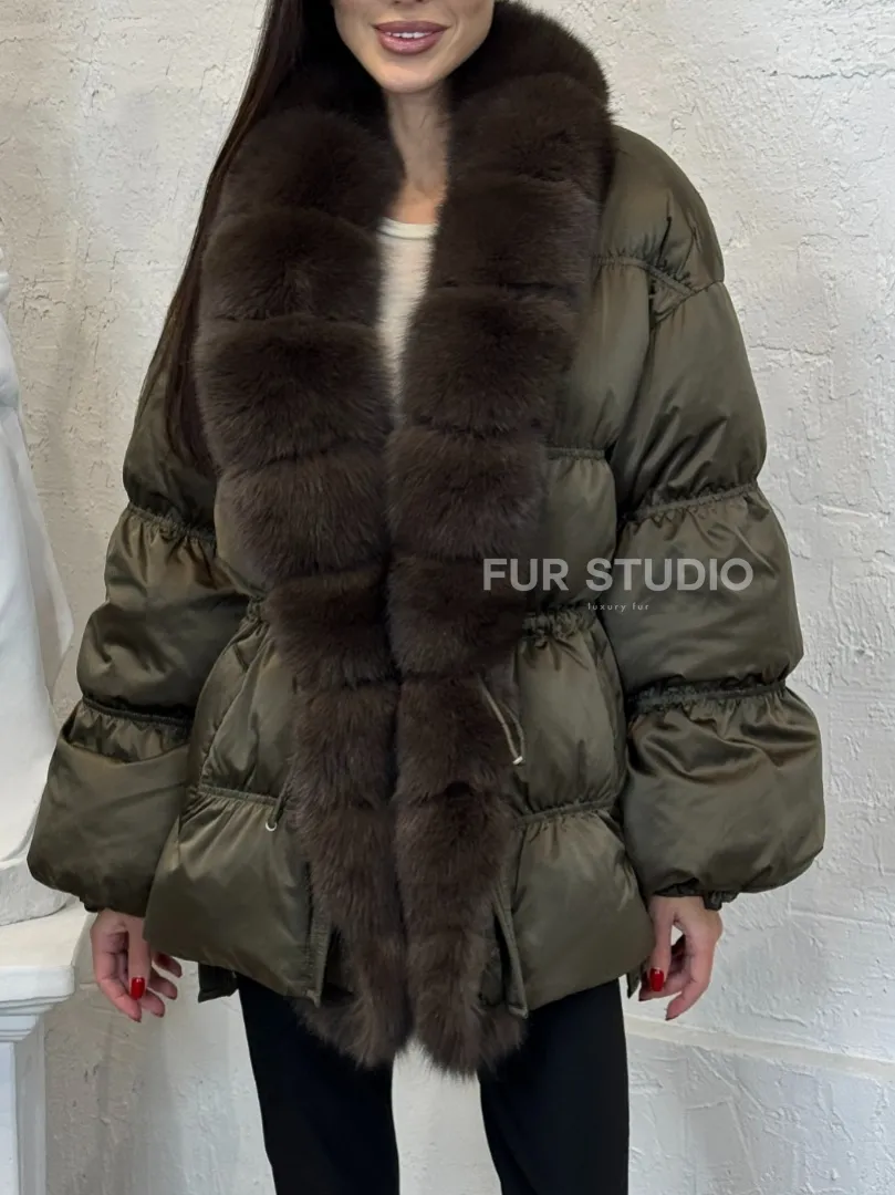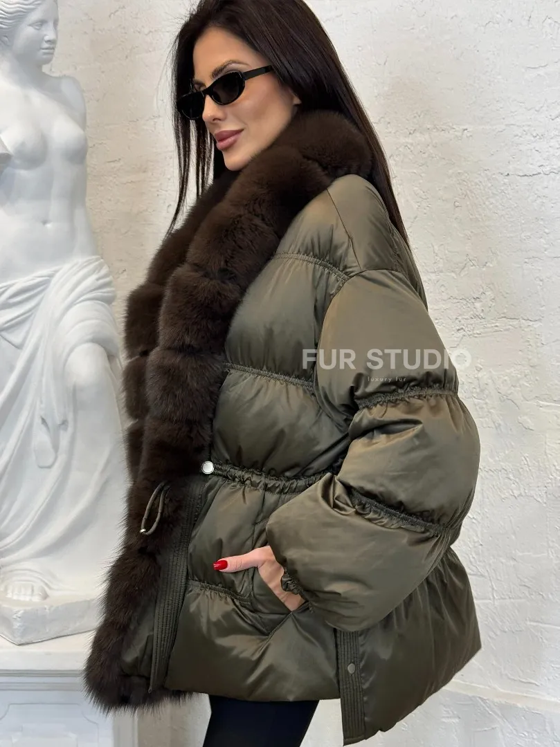 Женский стеганный пуховик на гусином пуху с отделкой из меха песца 101275