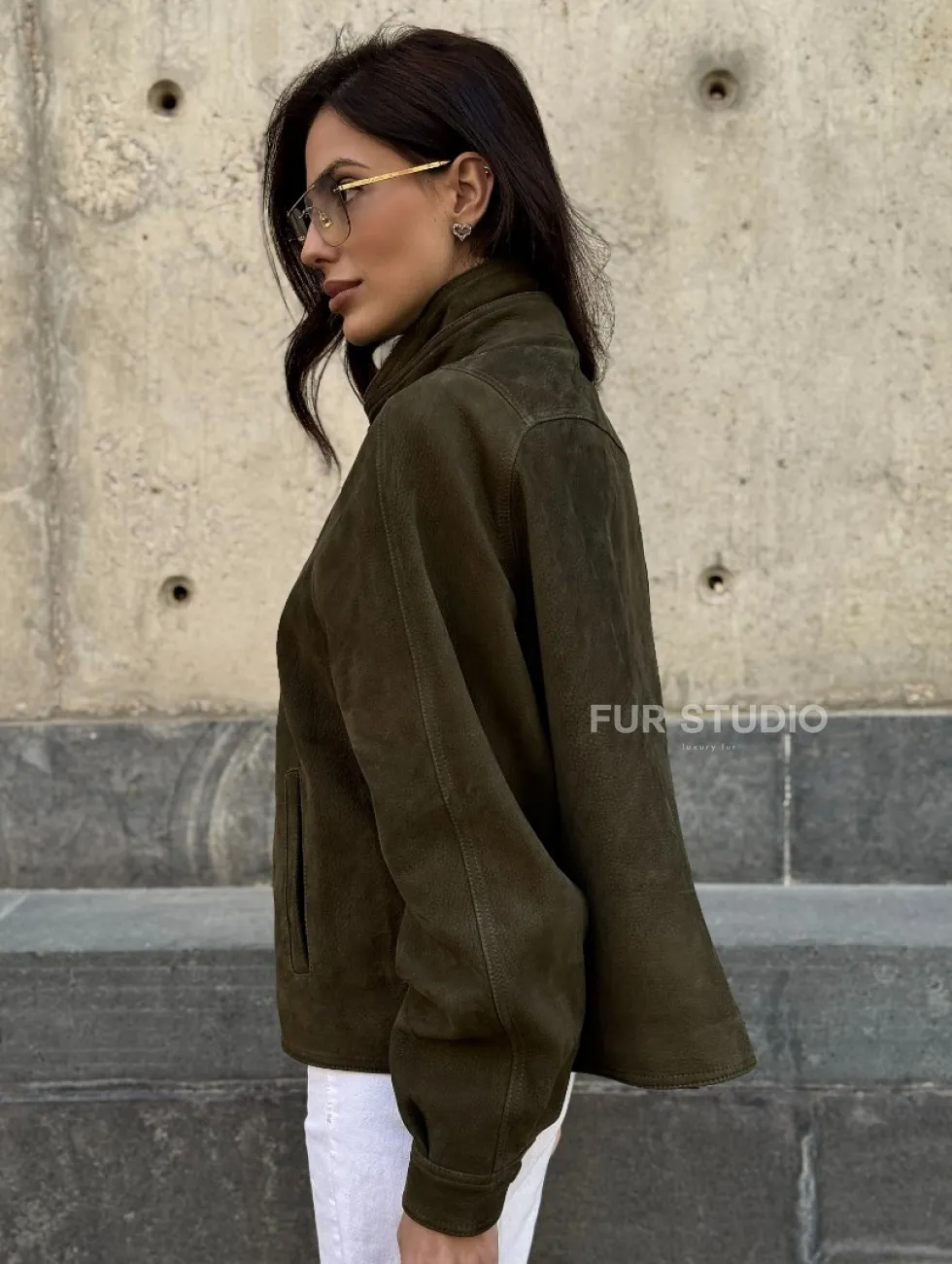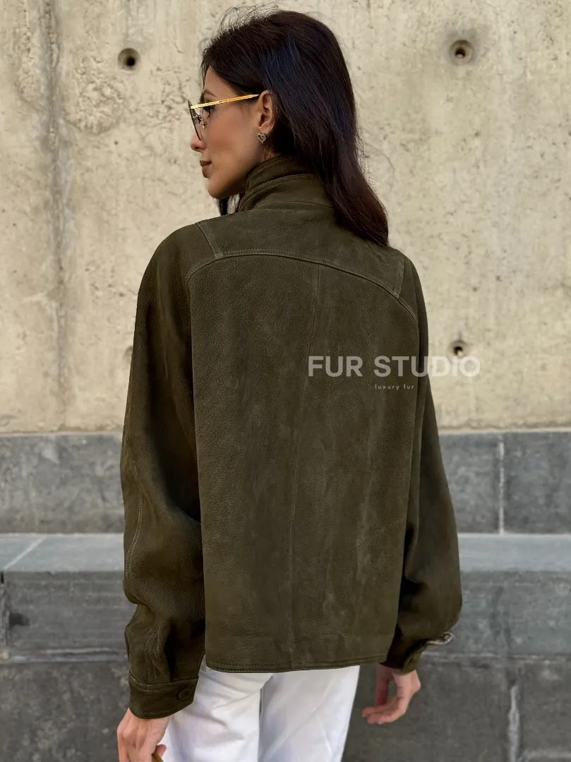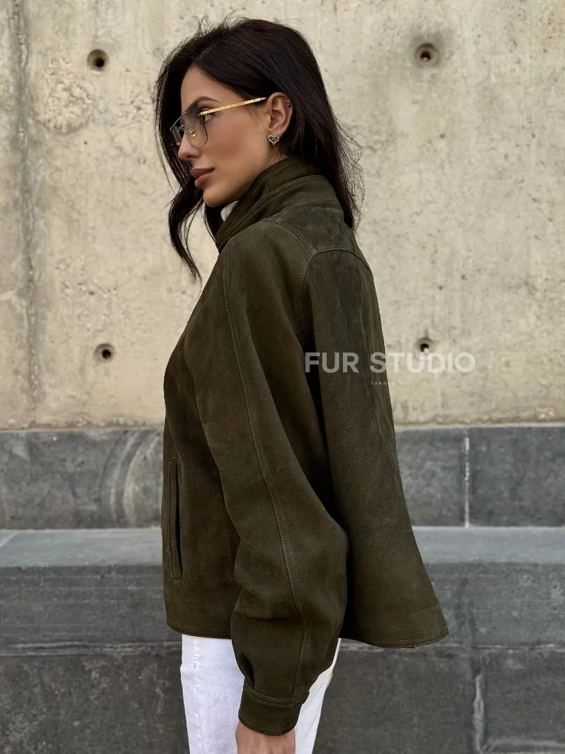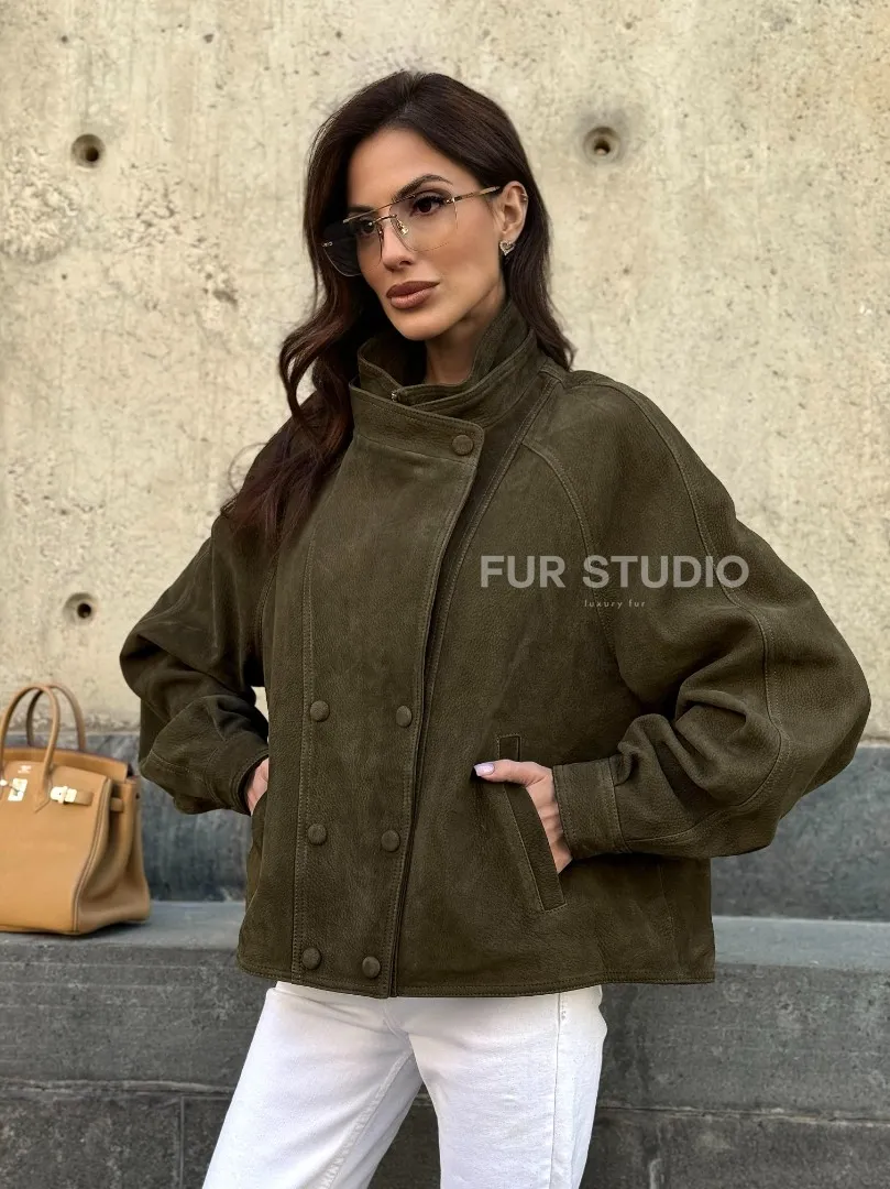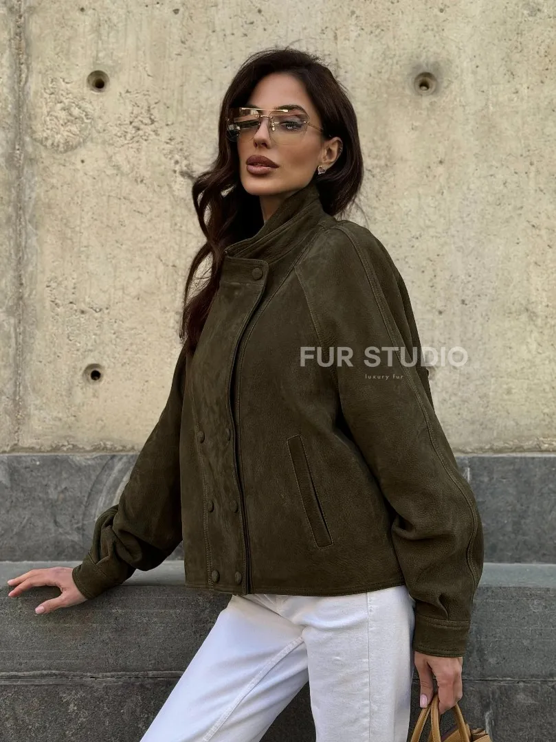 Женский замшевый блейзер - стойка воротник доступна для покупки в нашем шоуруме Furs Studio в Москве, где также предоставляется удобная доставка во все города России.