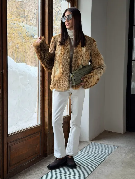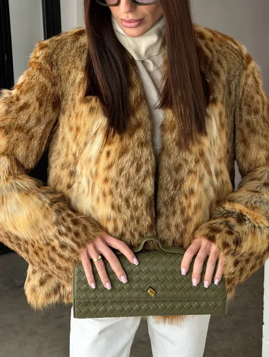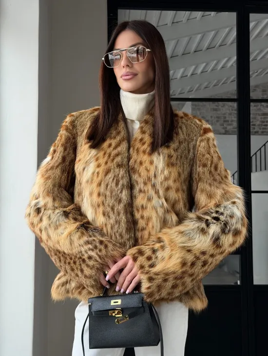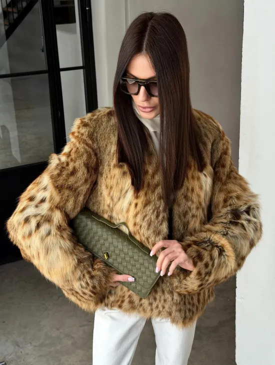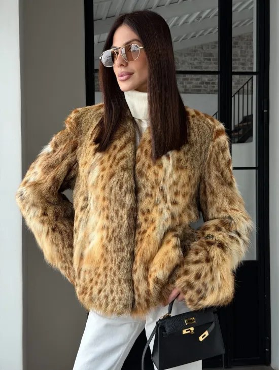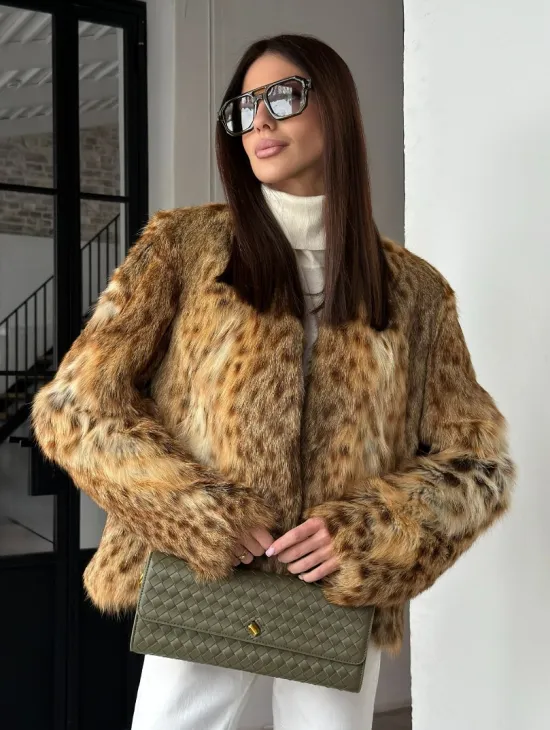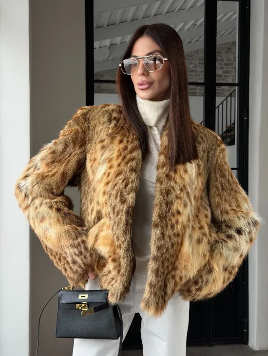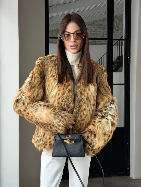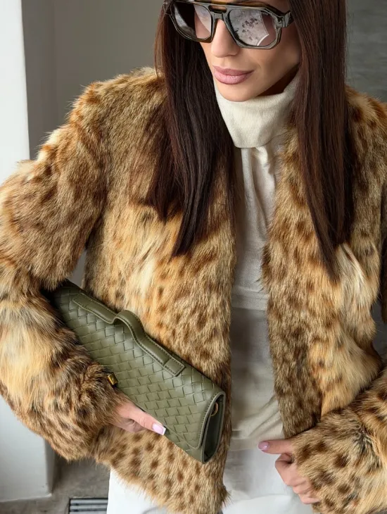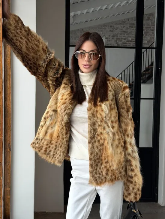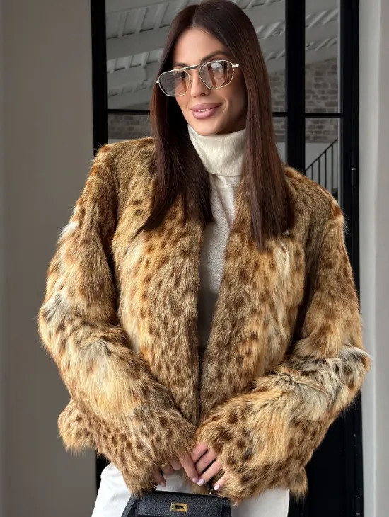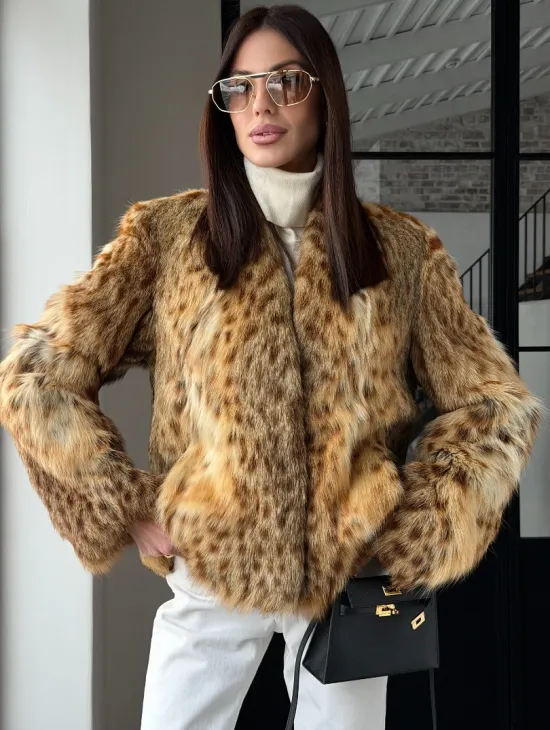 Мех данной шубы оцелот, цвет леопард. Предлагается в размерах от 42 до 54 (oversize). Длина модели 50-55 см, что выгодно подчеркивает фигуру девушек. Эта модель идеально подойдет для девушек и женщин, предпочитающих роскошные натуральные меха.
