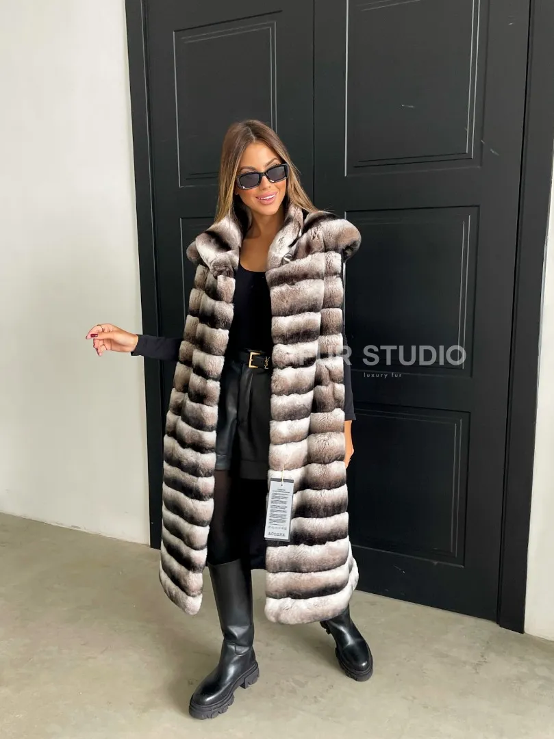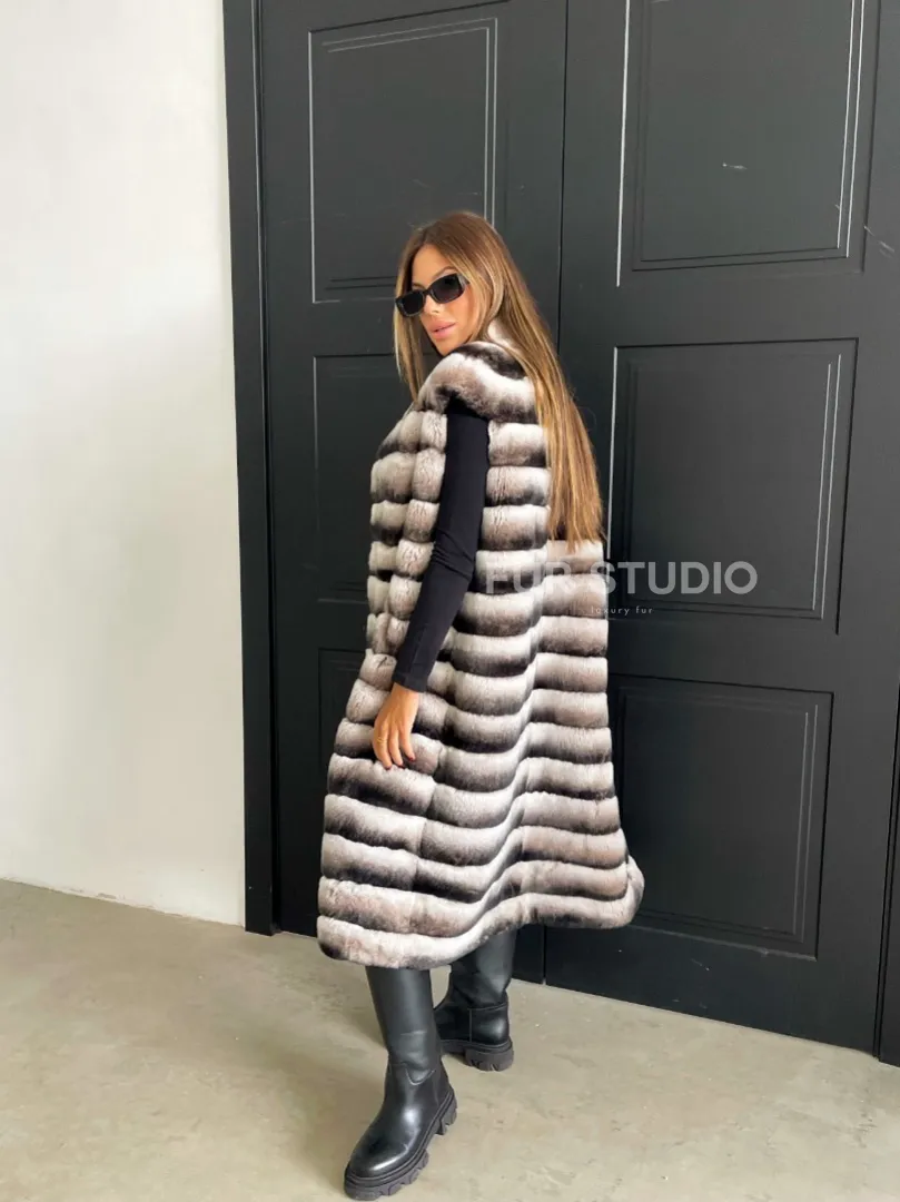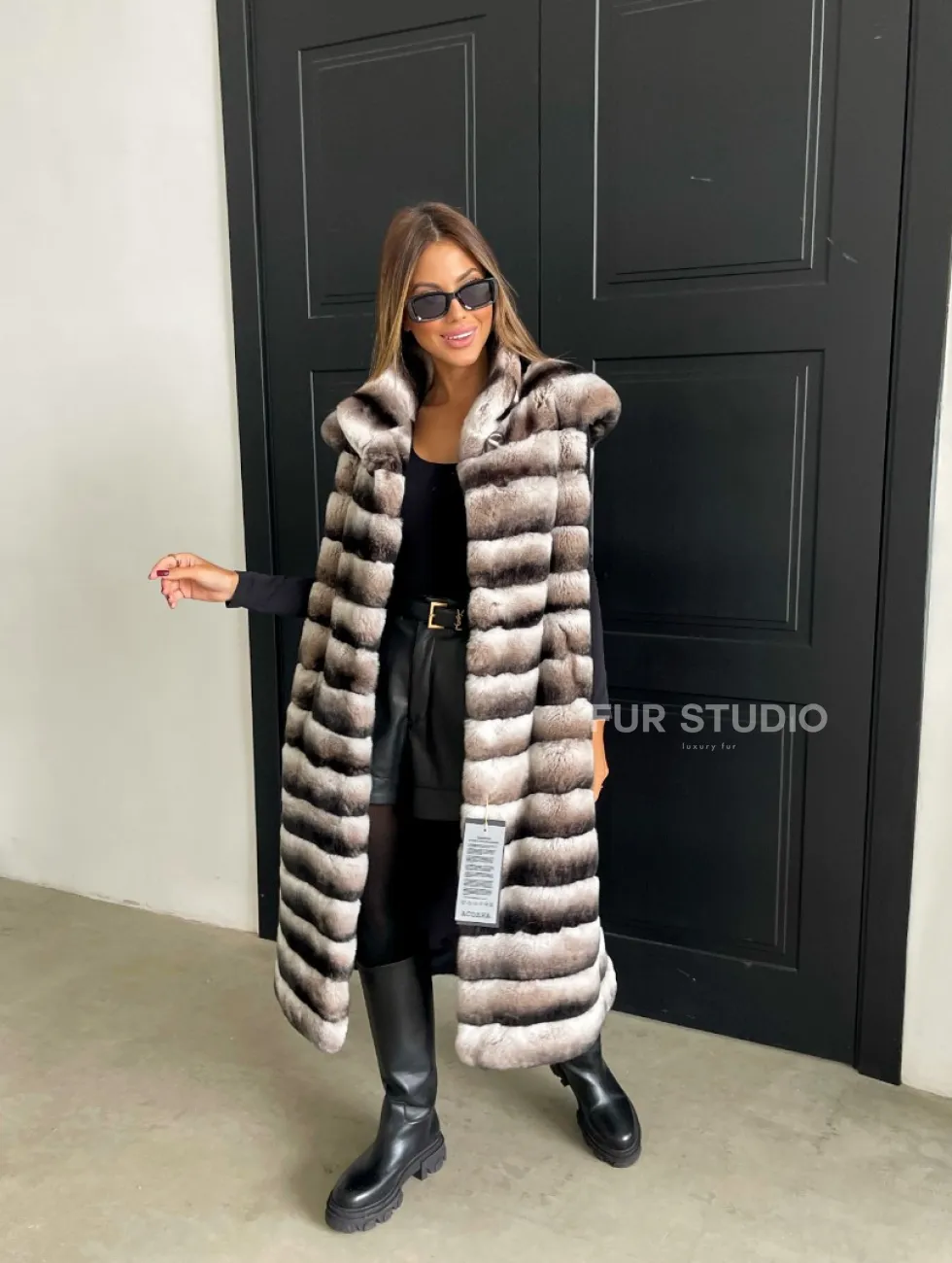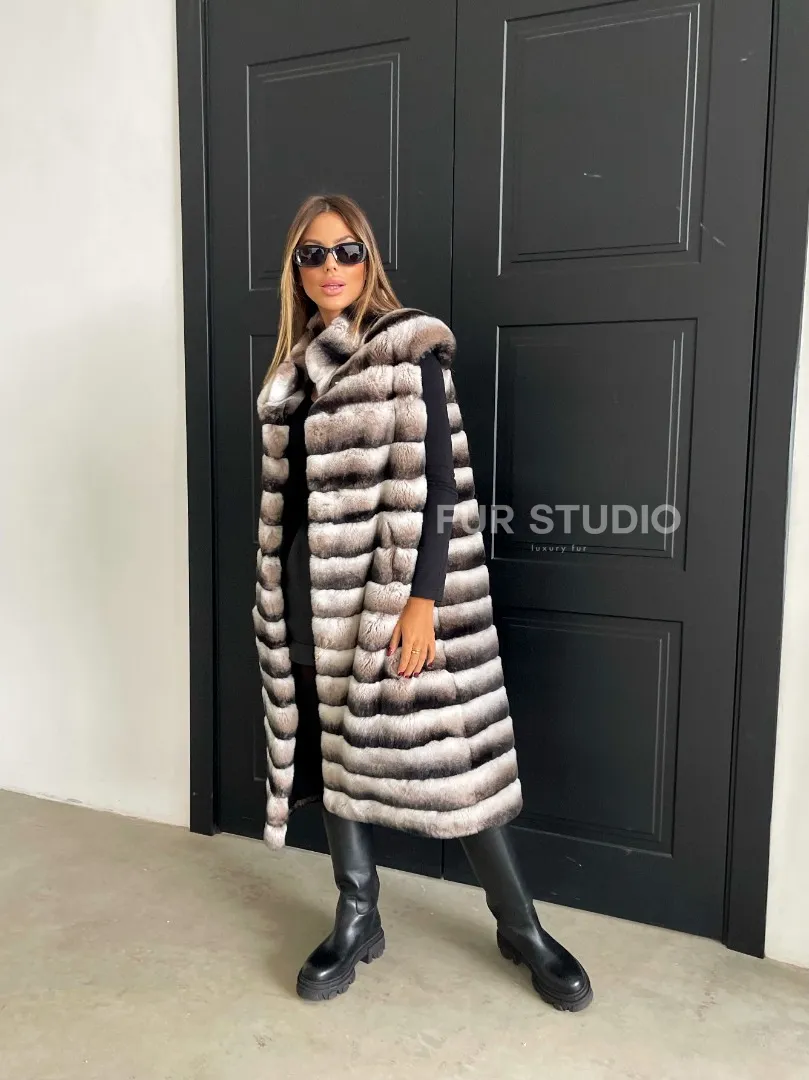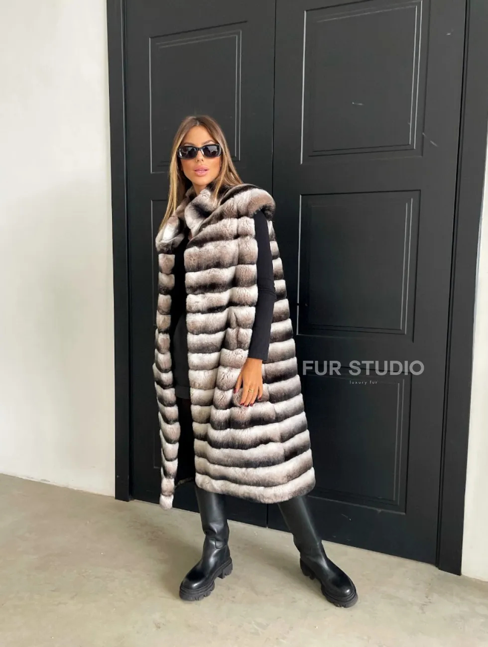 Жилет из меха орилага – отличный вариант для девушек, у кого ограничен бюджет. Изделие никогда не выйдет из моды. Удлиненный жилет зрительно увеличивает рост владелицы. Оригинальная расцветка подчеркнет роскошный оттенок волос и глаз хозяйки. Прямой крой сроет недостатки фигуры. Роскошный воротник позаботится о комфорте шеи и сделает акцент на ее грациозности.