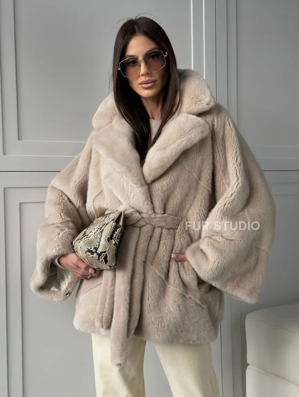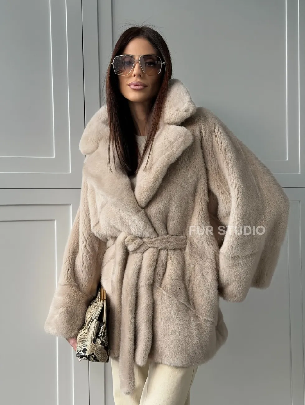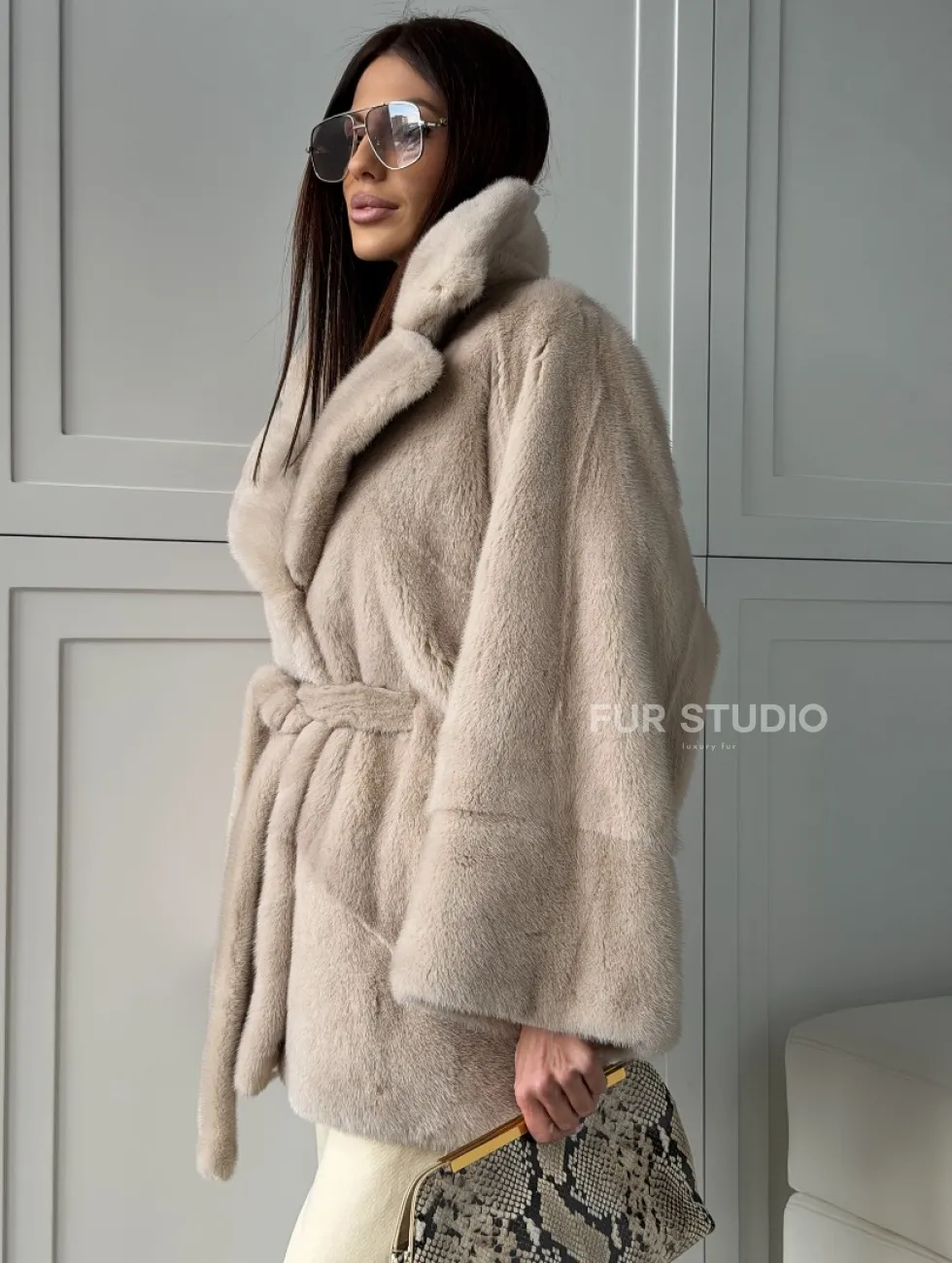 Мех данной шубы аукционная норка , цвет бежевый. Предлагается в размерах от 40 до 50 (oversize). Длина модели 75-80 см, что выгодно подчеркивает фигуру девушек. Эта модель идеально подойдет для девушек и женщин, предпочитающих роскошные натуральные меха.
